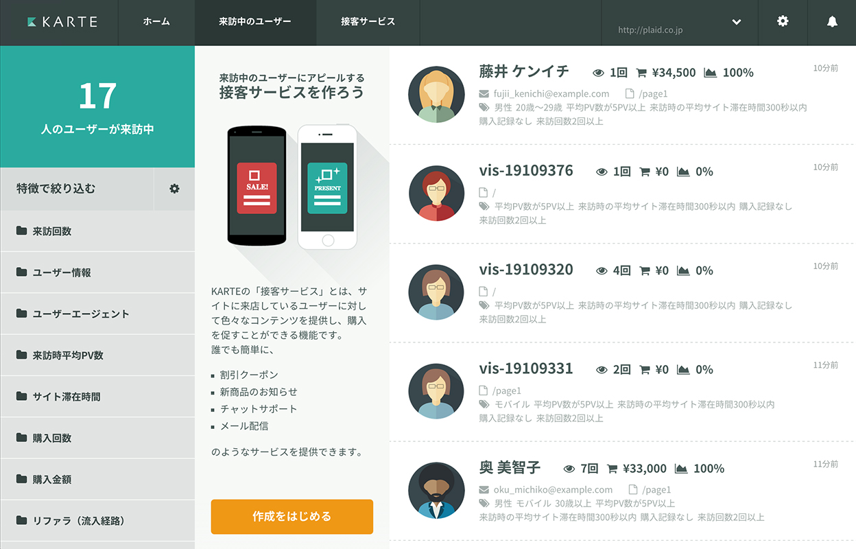 KARTEは、サイトに数行のJavaScriptコードを埋め込むことで、訪問者の特徴や行動をリアルタイムに解析しダッシュボード上に可視化してくれる。そしてあらかじめ設定しておけば、ユーザーの属性(会員/非会員、累計の購入金額、コンバージョン率、興味のある商品カテゴリなど)に合わせてクーポンの発行や商品のレコメンドなどができる。同社ではこのリアルタイムな対応を「ウェブ接客」とうたっているわけだ。サービスはECサイトであれば会員IDとの紐付けも可能だ。