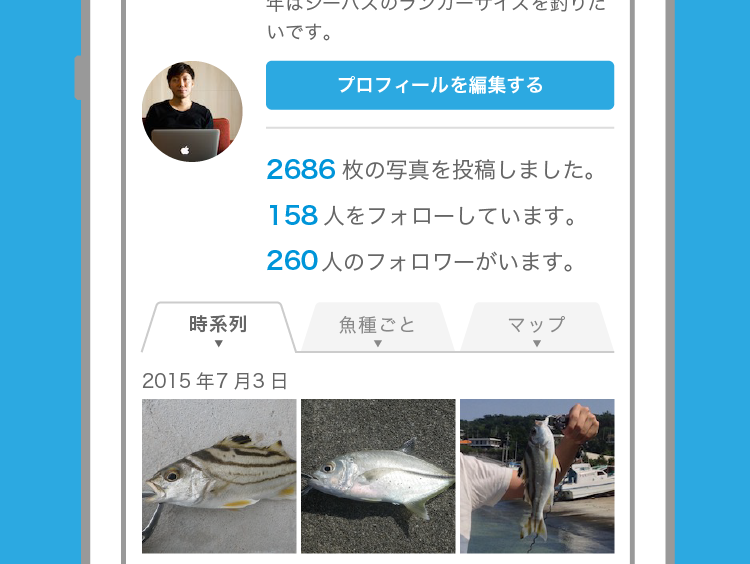 ツリバカメラは釣りをする人向けのアプリだ。釣った魚を撮影し、種類やサイズ、釣った場所や使用した餌の情報などを付けてアップロードし、自分の釣果アルバムを作ったり、その写真を共有したりできる。