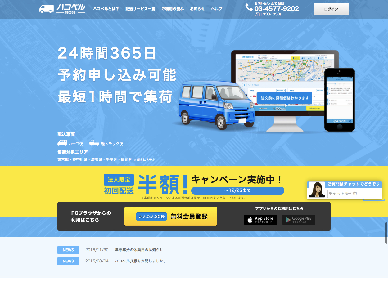 ハコベルはウェブサイトおよびスマートフォンアプリを使って、配送の予約が可能なサービス。ユーザーと、その周辺にいる配送業者のドライバーを直接マッチングする。集荷は最短1時間で、24時間365日予約申し込みが可能。GPSをもとに配送車両の位置情報を確認できるほか、5段階のドライバー評価制度といった機能を備える。