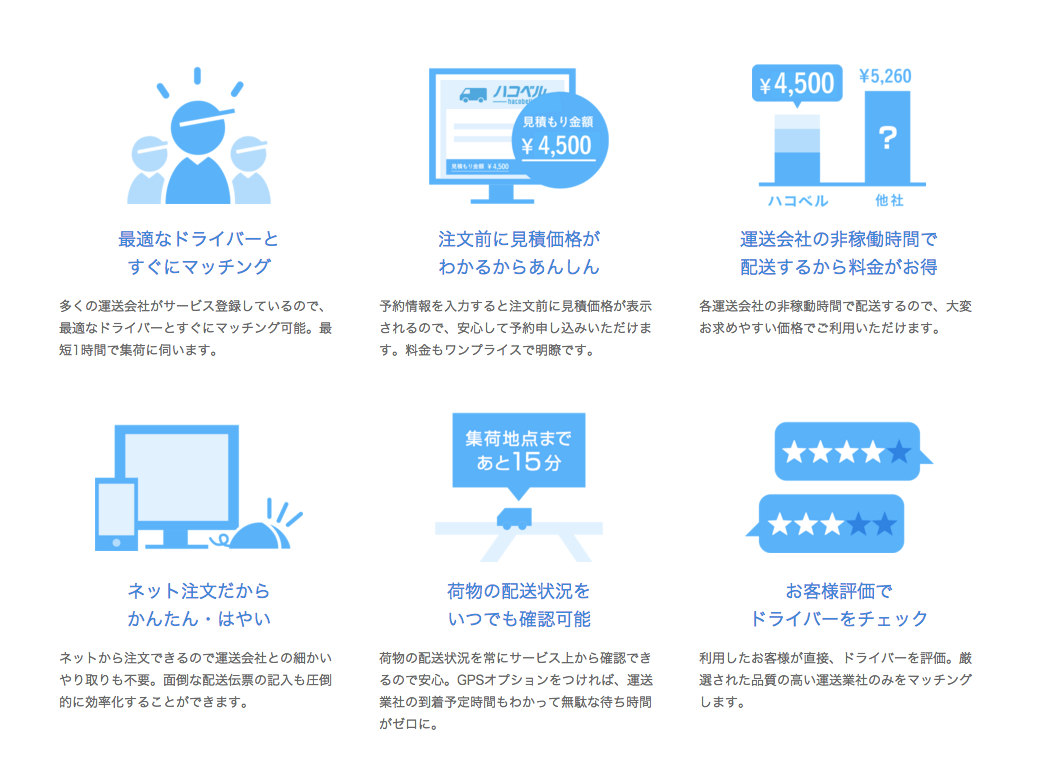 ハコベルはウェブサイトおよびスマートフォンアプリを使って、配送の予約が可能なサービス。ユーザーと、その周辺にいる配送業者のドライバーを直接マッチングする。集荷は最短1時間で、24時間365日予約申し込みが可能。GPSをもとに配送車両の位置情報を確認できるほか、5段階のドライバー評価制度といった機能を備える。