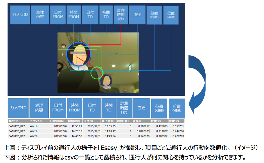 カメラで通過人数を把握するほか、閲覧者の顔を検知。ディスプレイを見ていた時間はどの程度の長さか、ディスプレイに近づいて見ていたのかどうか、まっすぐディスプレイに顔を向けていたのか、ディスプレイのどの部分を見ていたのかを、カメラが捉えた顔の直径などから判定。これを数値化してデータ解析することができる。複数ディスプレイにEsasyを設置すれば、どの広告物が注目を集めているのかをリアルタイムに把握できる。従来集められなかった客観的な数値データを集めることで、最適なディスプレイデザインの検討や、販促・企画に役立てることができるし、これまで成果の分かりづらかった屋外広告物の費用対効果を計測できるようになる。