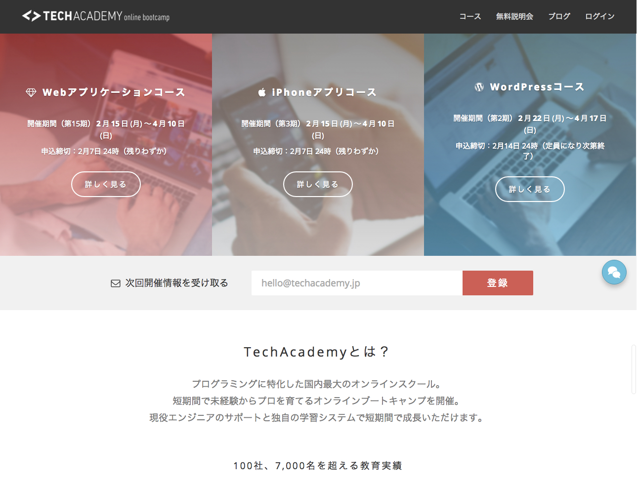 当初はオフィスの一部を教室にしてオフラインでのスクールを展開してきたが、2015年5月からはスクールをすべてオンライン化。「オンラインブートキャンプ」をうたい、ウェブアプリ、iPhoneアプリ、WordPressの3つのコースを展開してきた。同社によると、インターネット関連上場企業をはじめ100社7000人以上の教育実績を持つという。