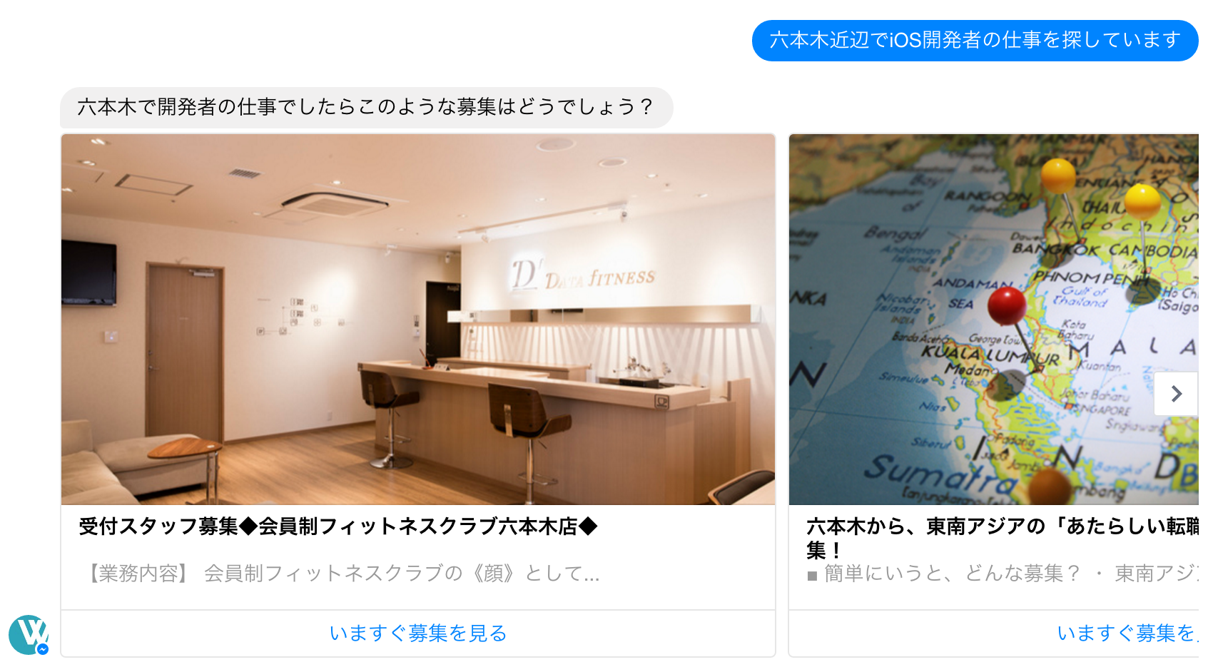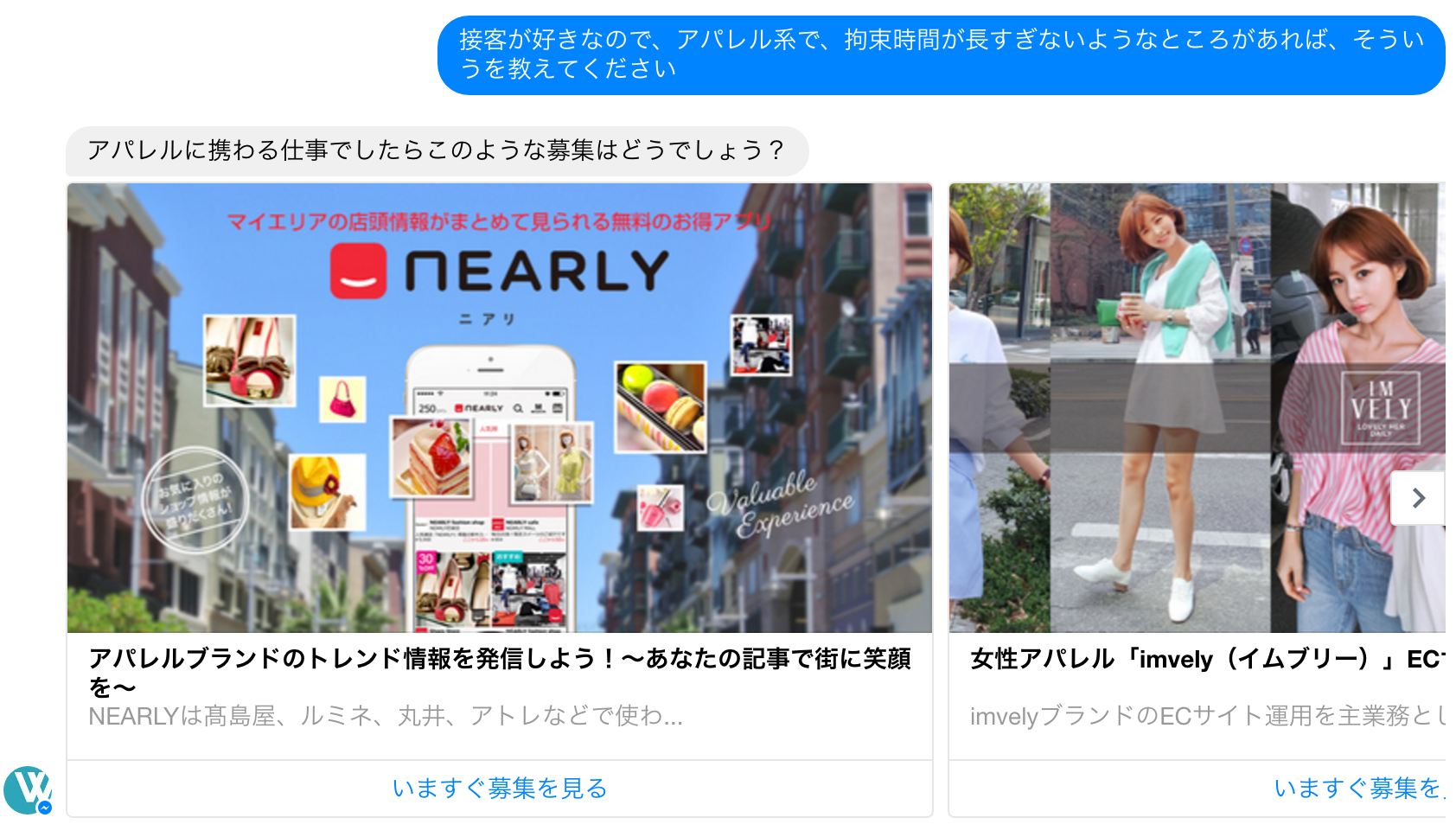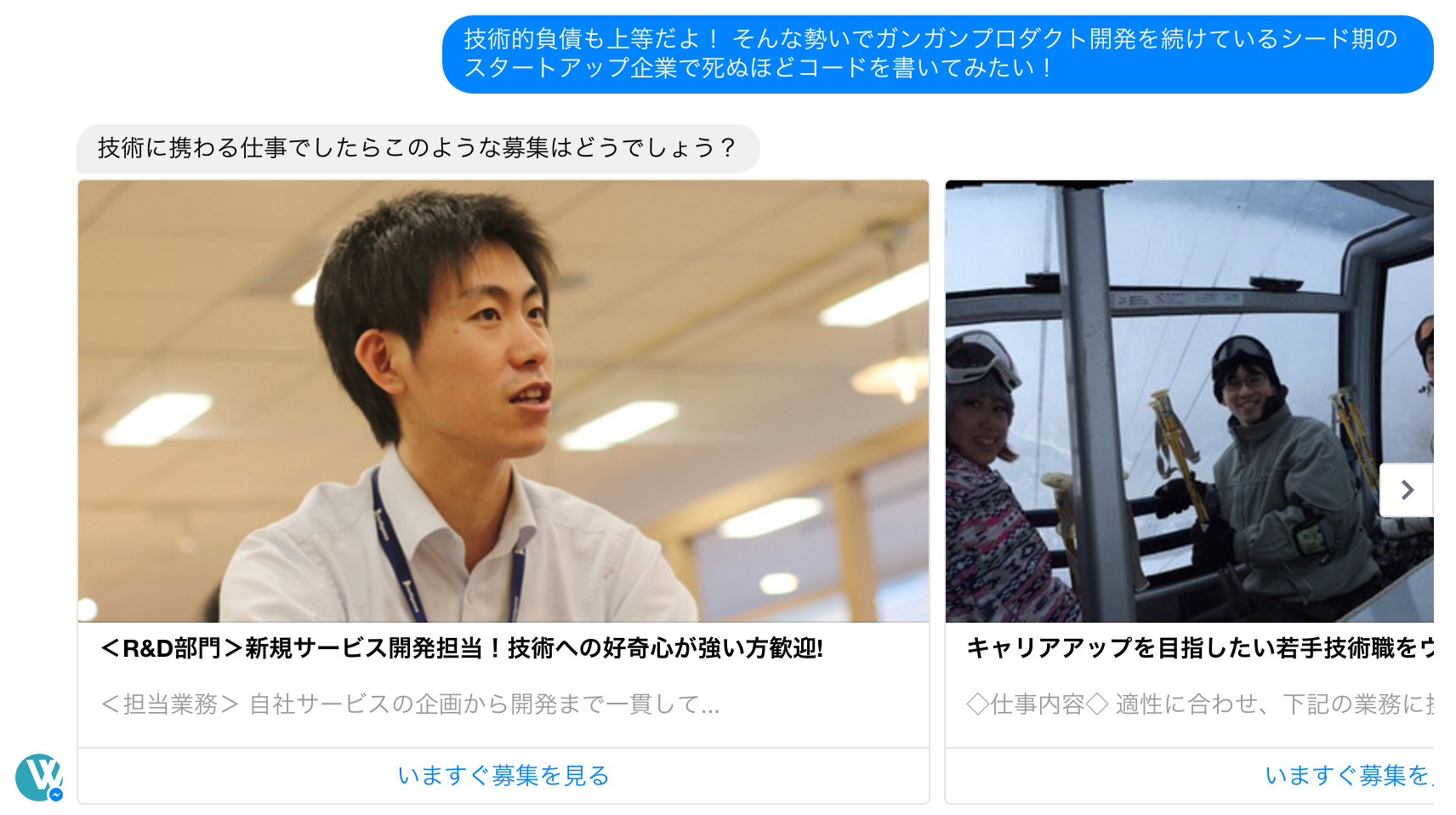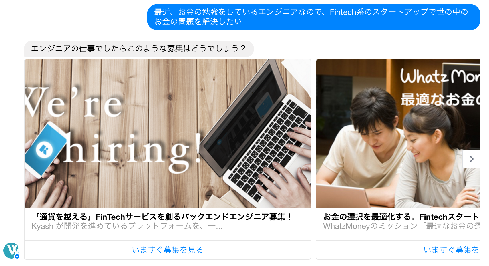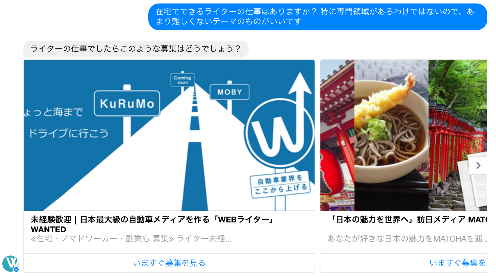 「例えば子どもができて仕事を辞めた主婦の方がいるとしますよね。アパレル系だったので、もう1度アパレル系の仕事がやりたいと質問があったとき、文章で返せるUIだと、『そういうのはないかもしれないけど、こういうのはどうですか?』という提案ができます。スタートアップ企業のカスタマーサポートの仕事なら電話対応なので自宅でやれますよ、とか」