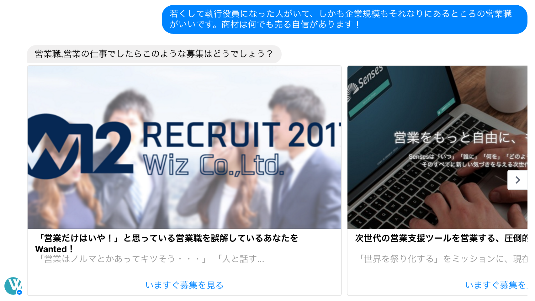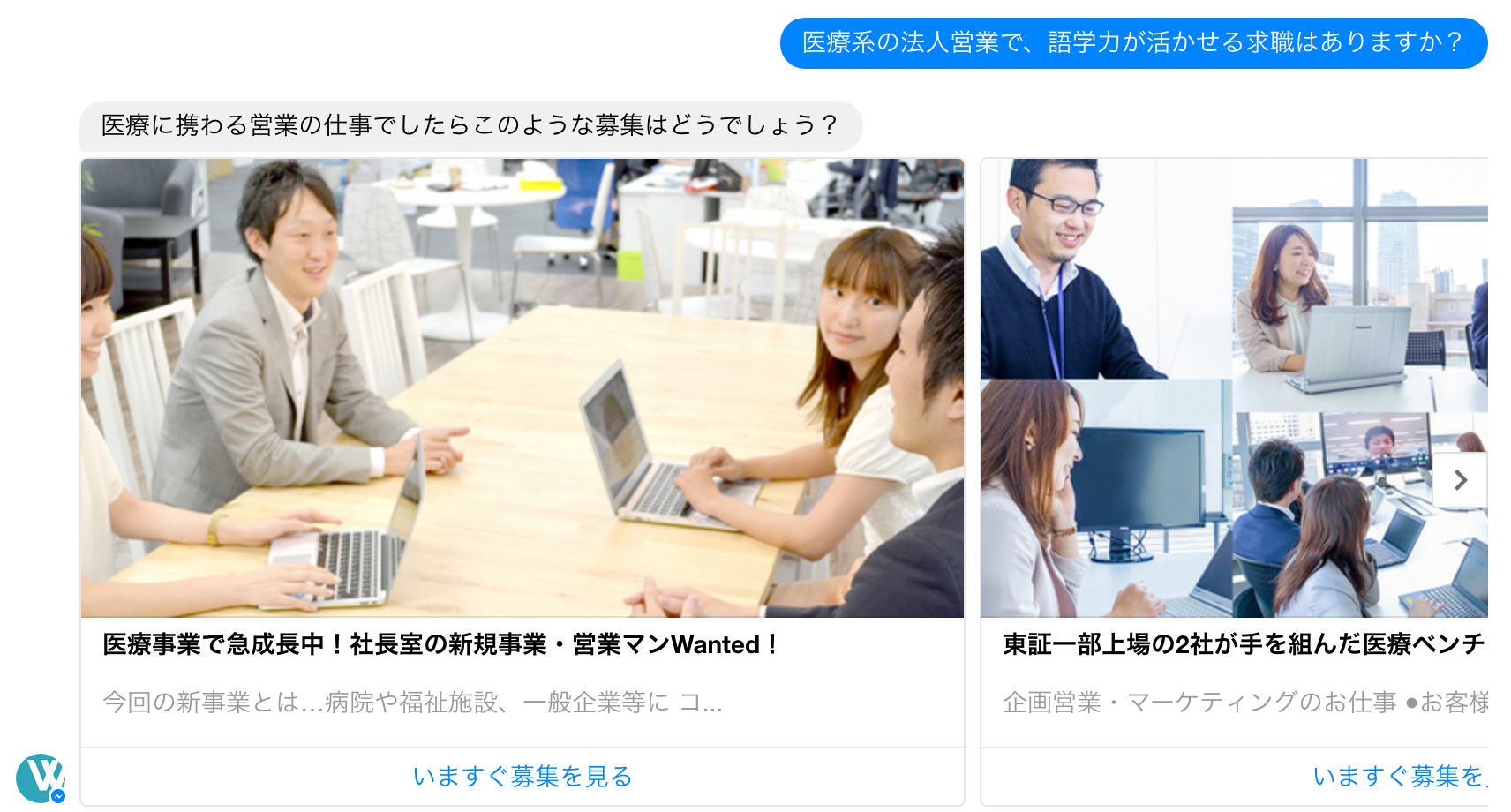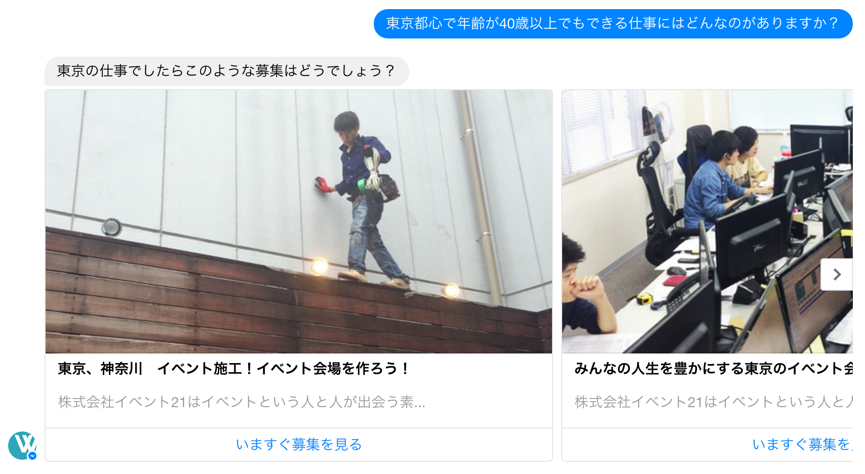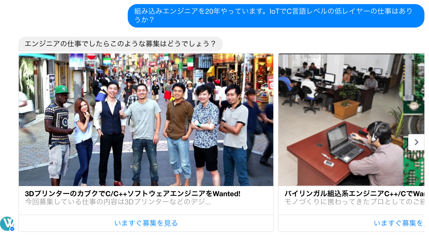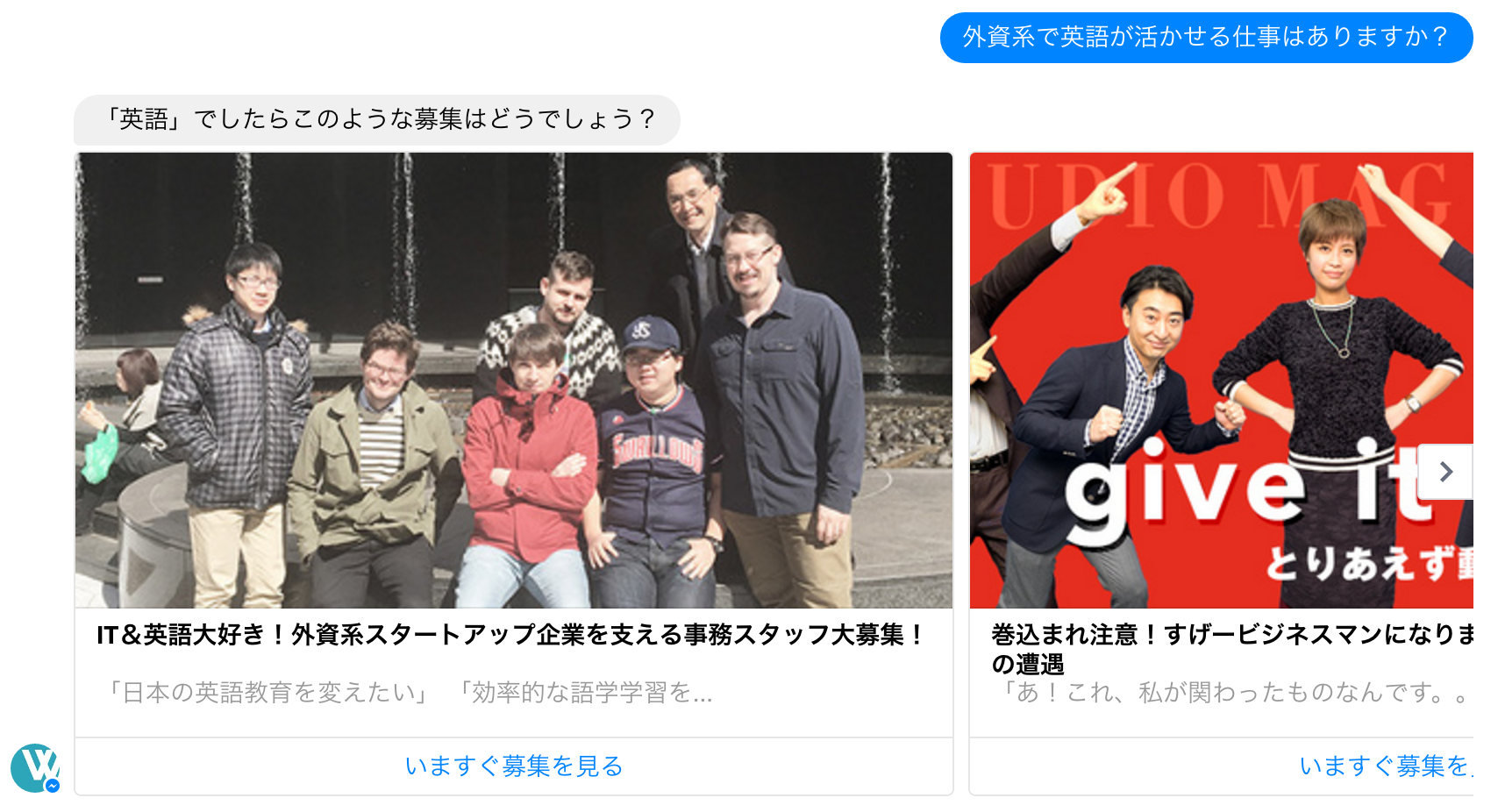 「例えば子どもができて仕事を辞めた主婦の方がいるとしますよね。アパレル系だったので、もう1度アパレル系の仕事がやりたいと質問があったとき、文章で返せるUIだと、『そういうのはないかもしれないけど、こういうのはどうですか?』という提案ができます。スタートアップ企業のカスタマーサポートの仕事なら電話対応なので自宅でやれますよ、とか」