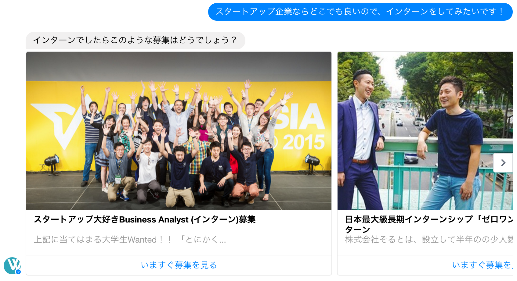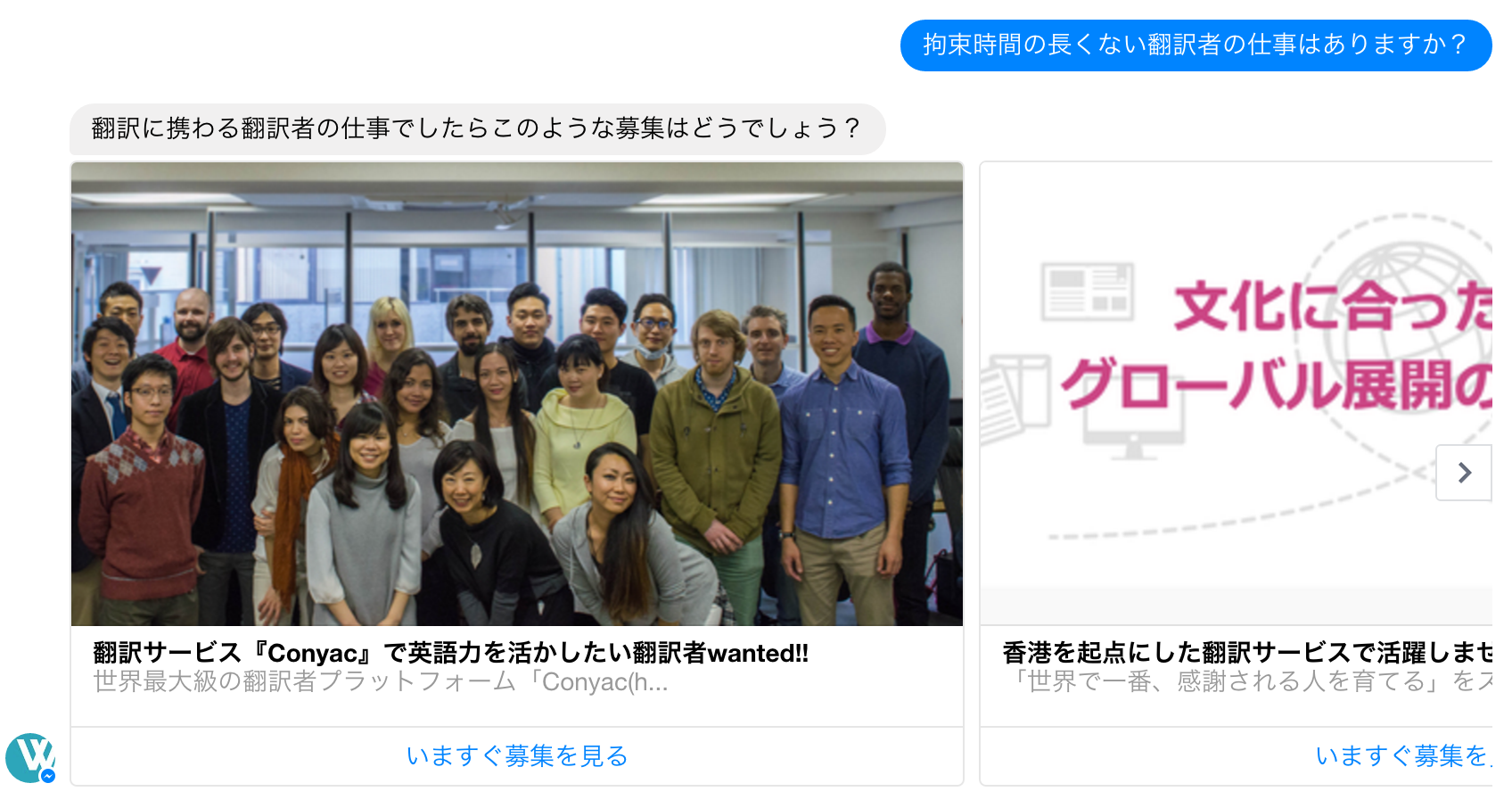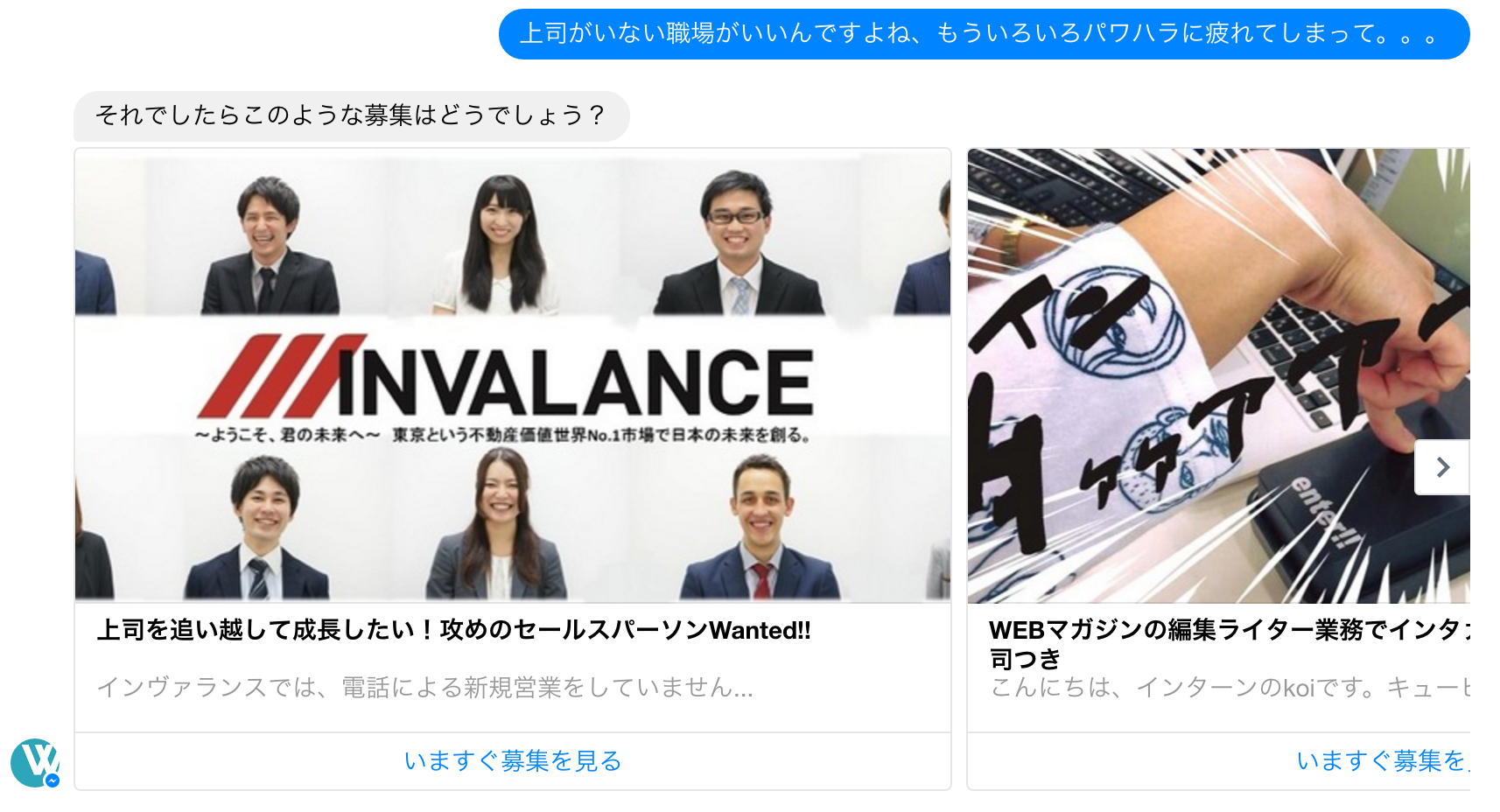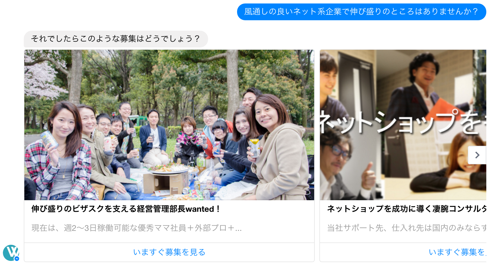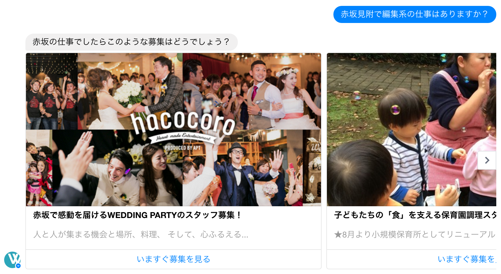 「例えば子どもができて仕事を辞めた主婦の方がいるとしますよね。アパレル系だったので、もう1度アパレル系の仕事がやりたいと質問があったとき、文章で返せるUIだと、『そういうのはないかもしれないけど、こういうのはどうですか?』という提案ができます。スタートアップ企業のカスタマーサポートの仕事なら電話対応なので自宅でやれますよ、とか」