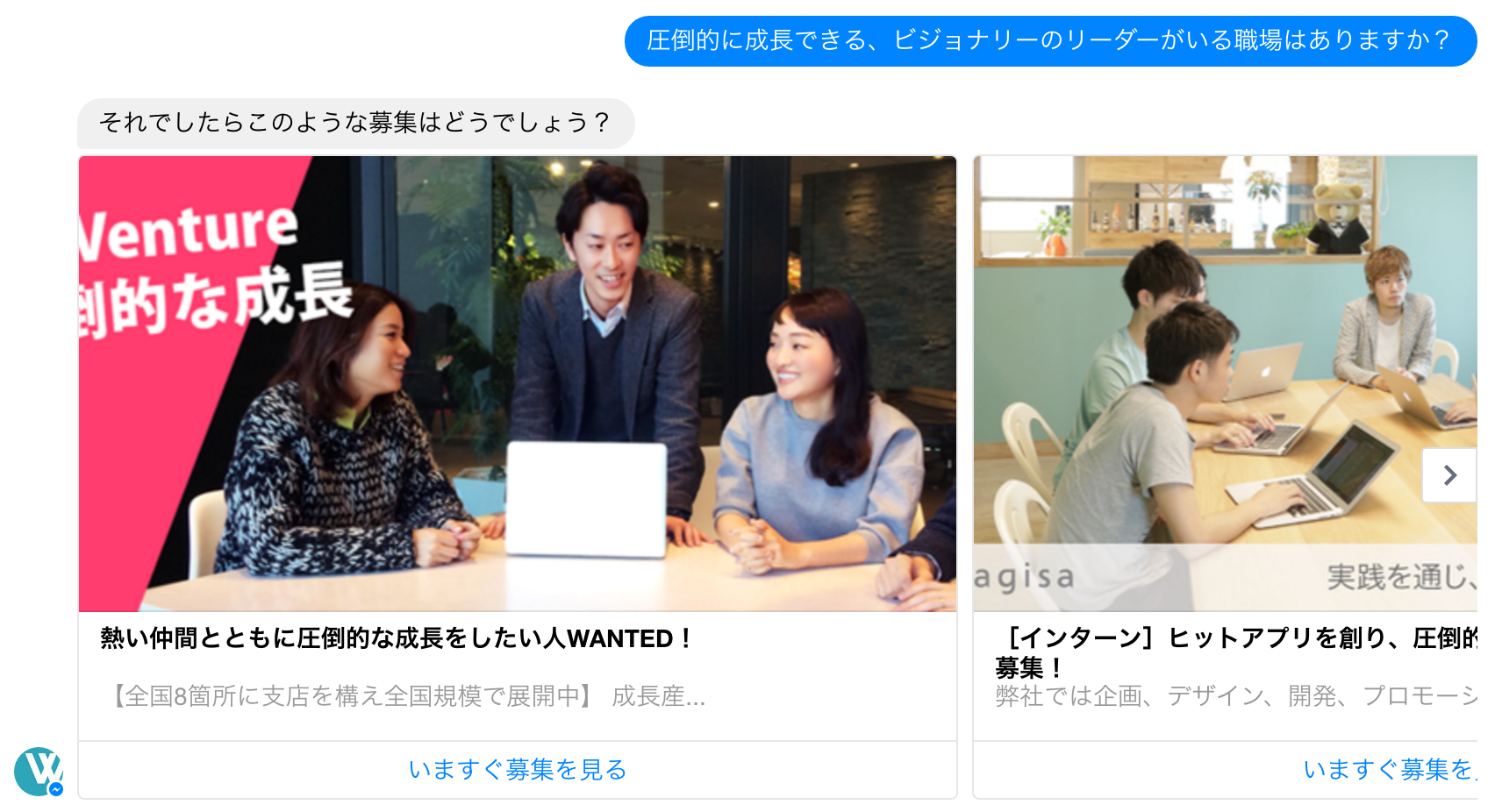 チャットUIだと、通常の仕事探しサイトと異なるクエリが出て来る可能性があって、そうした面にも期待しているという。例えば「上司がいない会社」(フラットな組織)とか、逆に「強烈なリーダーのいる組織」とかだ。