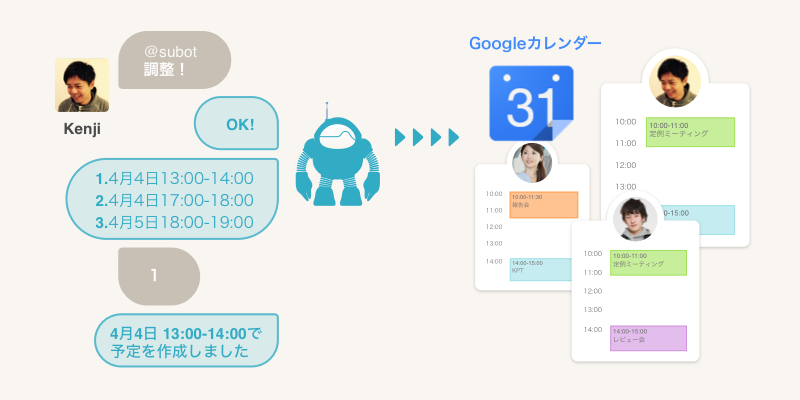 Subotは5月30日、コミュニケーションサービス「Slack」上で、リマインドやGoogleカレンダー連携のスケジュール管理が行えるボット「Subot(スーボット)」をローンチした。当初は無料で公開するが、将来的には月額課金制の導入を視野に入れる。