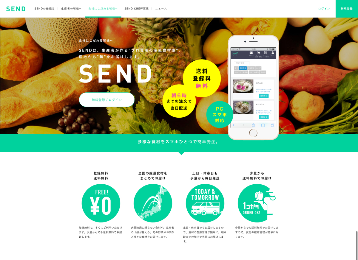 同社は2015年8月から農産流通プラットフォームのSENDの提供を開始した。SENDは農作物、肉類の生産者と飲食店の間での直接取引を実現するプラットフォームだ。飲食店はプラットフォームに登録した生産者が生産する食材などをオンラインで取引できる。特長となるのは、取引のためのオンラインでのプラットフォームだけでなく、食材保管用の拠点を自ら持ち検品から配送までも自前で行っている点だ。