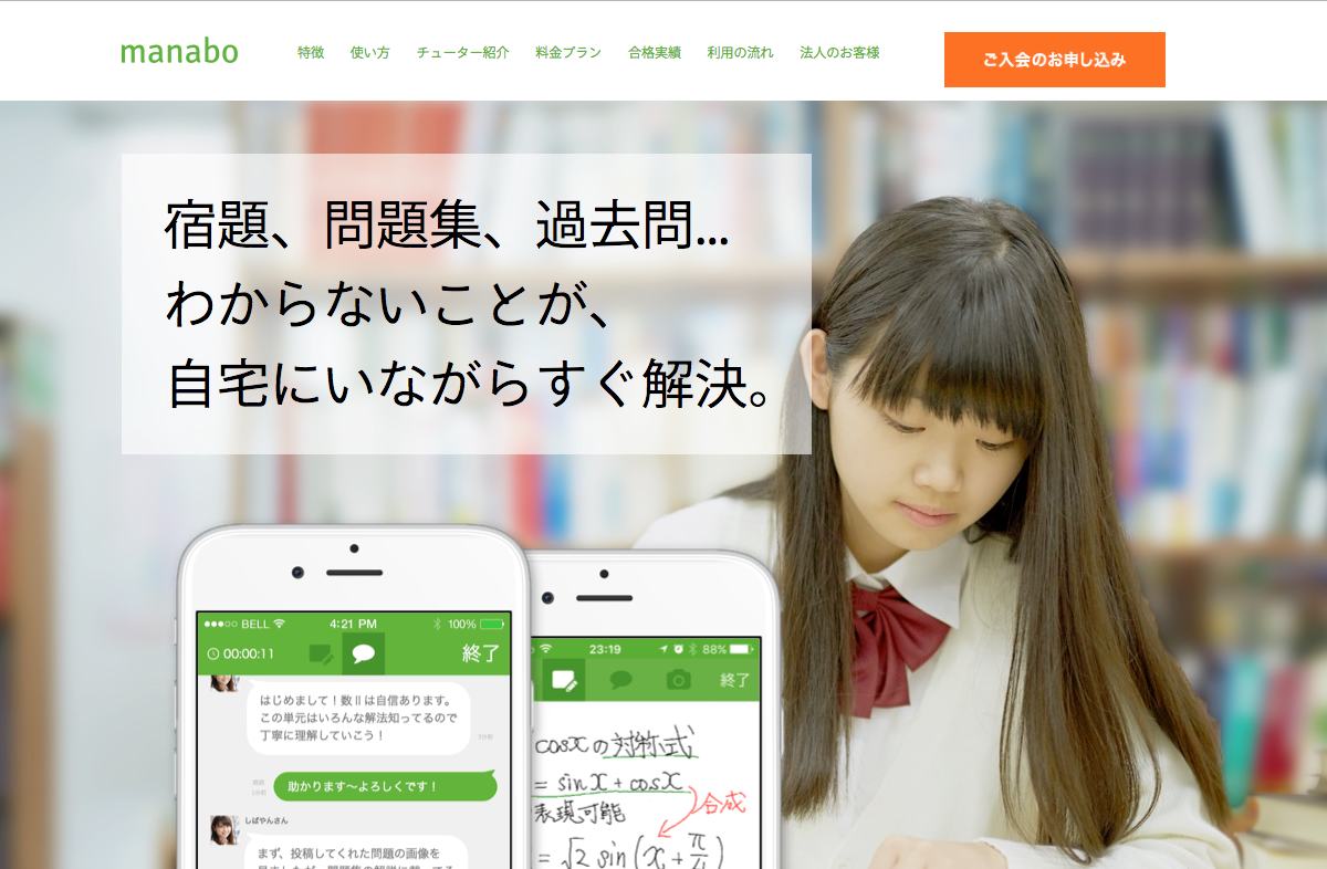 manaboはスマホアプリを通じて、生徒が宿題や問題集などの分からない部分を撮影し、チューターにオンデマンドでリアルタイムに質問できるサービス。主に有名大学の学生がチューターとして2000人以上在席しており、得意科目をアプリの音声通話と手書きの画像共有で教える。