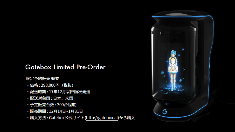 「好きなキャラクターと一緒に生活できる」——2015年2月にそのコンセプトを明らかにし、2016年1月にはプロトタイプも披露してくれたウィンクルのバーチャルホームロボット(当初はコミュニケーションロボットと呼んでいた)「Gatebox」。その販売がいよいよスタートする。ウィンクルは12月14日、公式サイトにてGateboxの限定予約販売を開始した。価格は税別29万8000円で、販売対象は日本および米国。販売期間は2017年1月31日まで。予約販売台数は300台程度を見込んでいる。なお発送は2017年12月以降と少し先の予定になっているている。