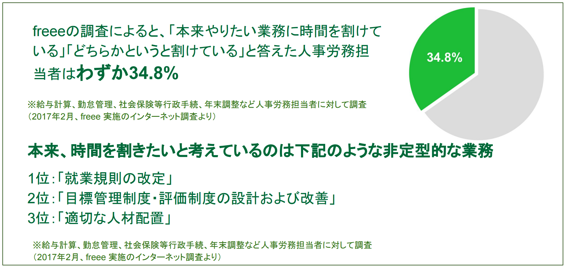 長時間労働の是正や柔軟なワークスタイルの推進、生産性の向上など、人事労務部門が“本業”として時間をかけるべき業務はいわゆる「労務事務」ではないという話題はTechCrunch Schoolでも挙がっていた。freeeが企業の人事労務担当者に対して2月に実施した調査でも、同様の結果が出ている。