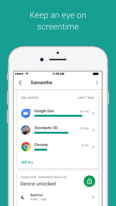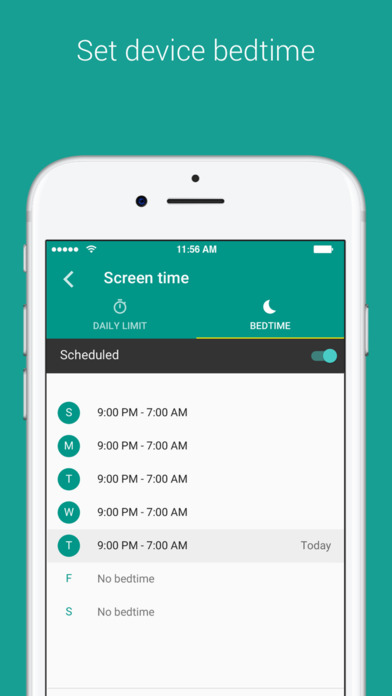 さらに親は、子どもがどのアプリで各週/各月過ごしているか、という統計を見たり、スケジュールを決めて子どものデバイスをリモートでロックできる(デバイスの就寝時刻)。また毎日のスマホ使用時間も設定できる。