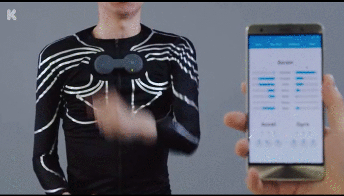 e-skinは「e-skin Shirt」を羽織って、胸の部分にコントローラーとなる「e-skin Hub」を取り付けて使う。e-skin Shirtsは14個の伸縮センサーを搭載していて、e-skin Hubには加速度計、ジャイロセンサー、6軸のモーションセンサーが備わっている。e-skinはBluetooth経由でスマホやPCとの接続が可能だ。