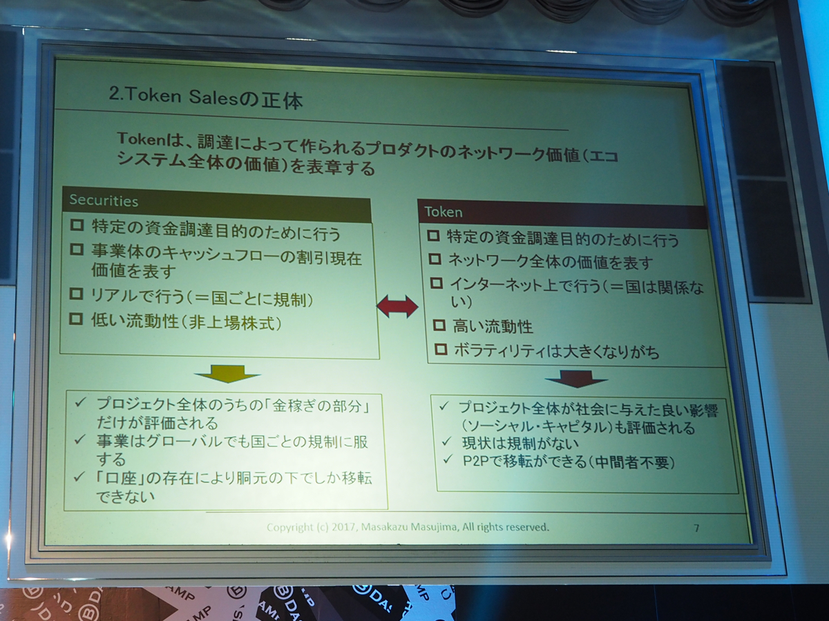 株式でもトークンでも、特定の資金調達目的のために発行するが、その価値の基準は、株式での調達は事業体のキャッシュフローの割引現在価値を表す(ざっくり言えば、事業体が金を稼いでいるか、今後稼げるか)ことに対して、トークンでの調達はネットワーク全体の価値を表す(事業体が稼げるかだけでなく、ソーシャルグッドなアクションをすることで価値が高まることなども価値になる)という。