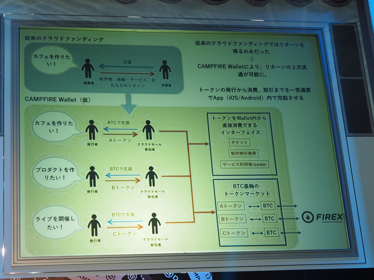 そのCOMSAの導入第3弾企業としてプレスリリースにも名前が挙がっていたのがCAMPFIREだ。家入氏は「早速株主から電話がかかってきて『どういうことだ』と聞かれた」と導入についてぼかして語った上で、クラウドファンディングとICOの関係について説明する。