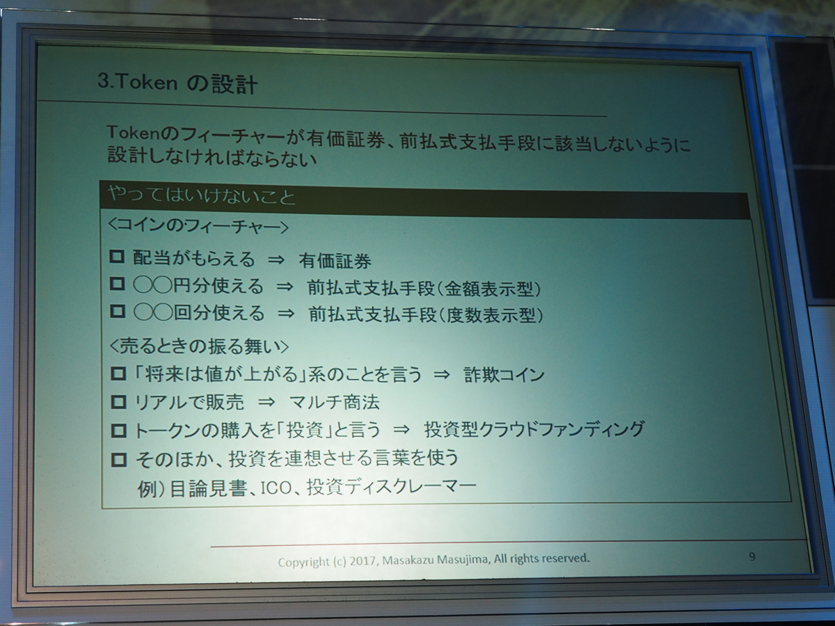「まだ実証されていない領域なので試行錯誤ではあるが、現状トークンを出している上場企業があるかないかというとある。(東証JQGの)フィスコが『フィスココイン』をやっている。問題があるか、ないか、というと『ないはず』だと思っている。トークンと株の関係が論点になるかもしれないが、(トークンは)有価証券ではないので不明だ」(増島氏)