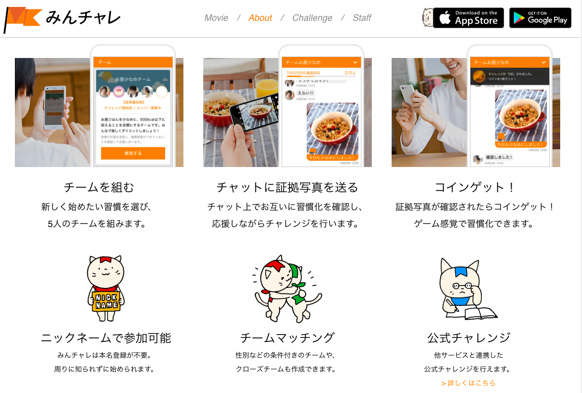 チャレンジのテーマは、英語、ダイエット、投資、ゲーム、早起き、朝活(勉強)、運動(ウォーキング)などがある。1人の利用者が複数チームに参加することが多く、ユーザーごとの平均参加チーム数は3チーム。