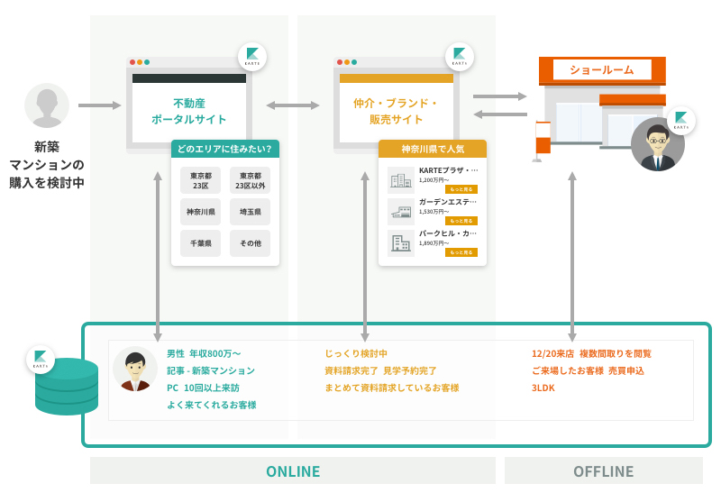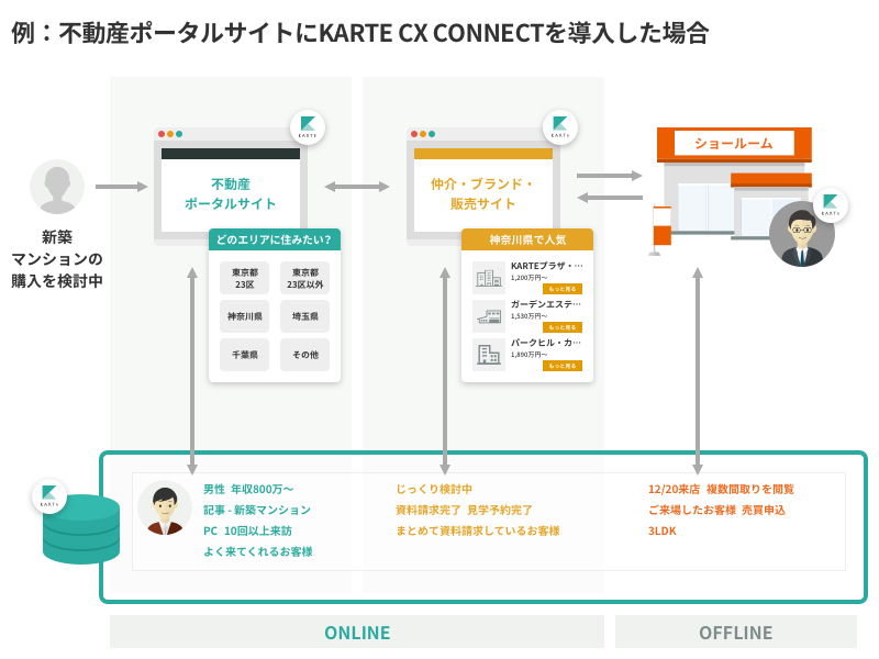 例えば不動産サイトの場合、不動産ポータルサイトと仲介サイトやブランド・販売サイト、顧客とのタッチポイントとなるショールームのそれぞれにKARTE CX CONNECTを導入することで、マンションの購入を検討する顧客の行動の流れを一気通貫で把握することができる。
