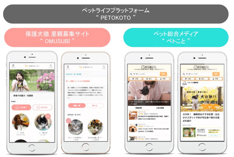 現在シロップが展開しているのは、ペットの飼い主向けメディア「ペトこと」と保護犬猫と飼いたい人をマッチングする「OMUSUBI(おむすび)」の2つ。