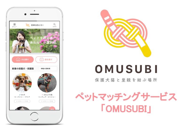 もうひとつのOMUSUBIは犬猫の殺処分問題を解決する目的で2016年12月にベータ版をリリース。保護犬猫の飼い主を募集する団体と、飼いたい人をマッチングする。2017年9月からは提供範囲を拡大し登録団体が28団体、累計の会員数が1300名。累計の応募数も200を超えた。