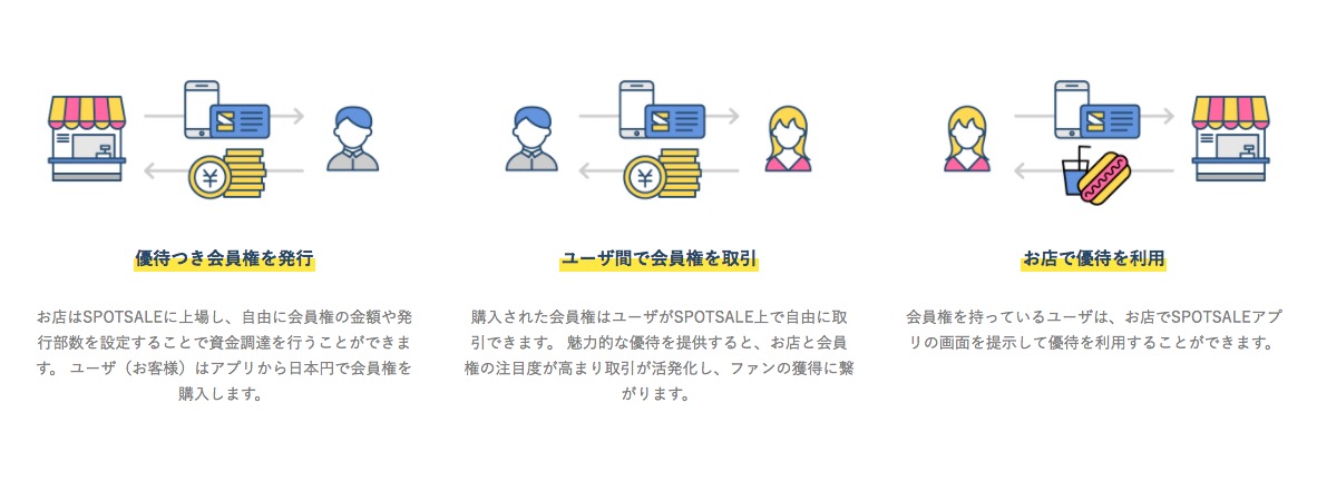 たしかに店舗が複数の個人から資金を調達できることに加えて、顧客の獲得手段としても活用できる点ではクラウドファンディングに近い。また会員権をユーザー同士で取引できる仕組みや、店舗がSPOTSALEを活用する際に「SPOTSALEに上場する」という表現が使われているあたりは、ICOに似ている点もある。