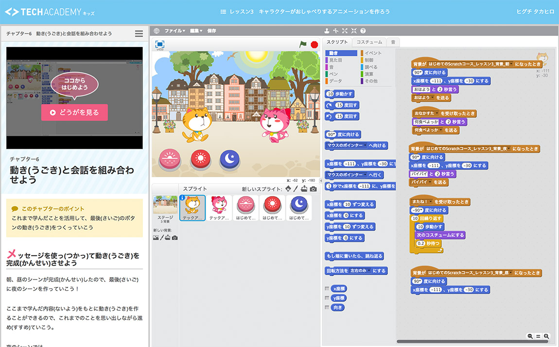 TechAcademyキッズでは子ども向けプログラミング言語「Scratch」を利用したコースを提供し、まずはゲーム感覚で楽しみながらプログラミングを学べるようにする。今後はWebアプリケーションやスマートフォンアプリなどステップに応じた教材も用意していくという。