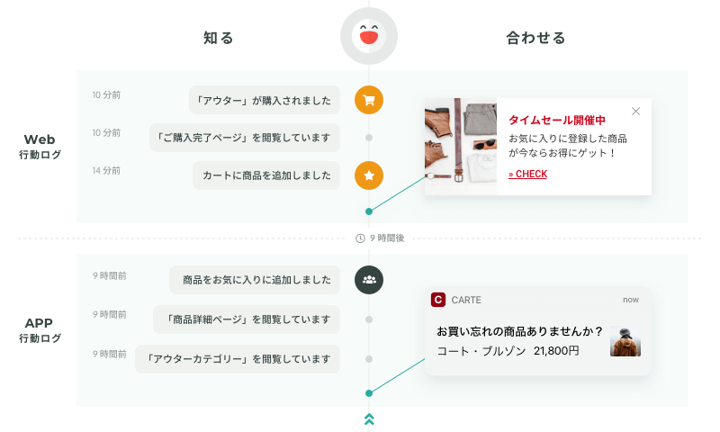 3つ目は、ウェブサイトと相互にユーザー行動を解析し、コミュニケーションする機能。ウェブでKARTEを導入済みであれば、共通の管理画面でウェブとアプリ双方を横断的に解析できる。例えば夜、PCでウェブサイトを閲覧していたユーザーが、朝、通勤中にスマホアプリからアクセスしてきた場合に、プッシュ通知を送るなど、ワンストップでコミュニケーションを取ることも可能だ。