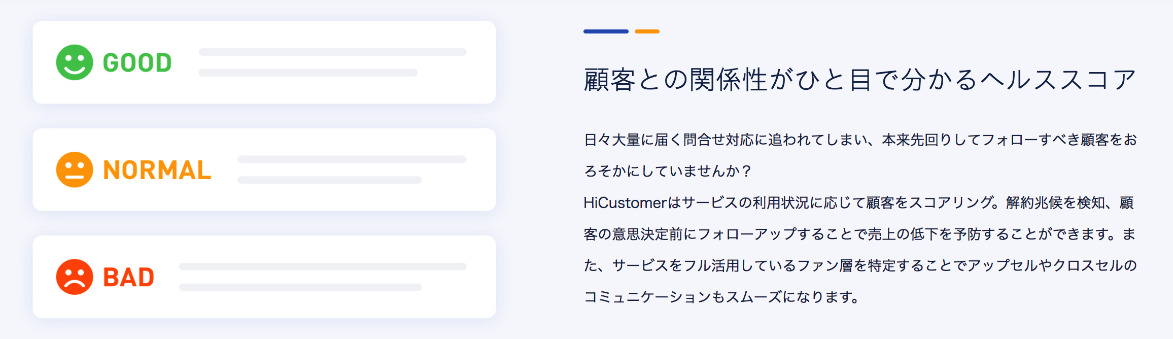 導入企業はまず、自社のプロダクト(もちろんサブスクリプションモデルの製品だ)に最適な顧客のルール設定を行い、HiCustomer上にデータを取り込む必要がある。例えばプロダクトの活動頻度や満足度、利用頻度などの度合を、プロダクトを利用するステージごとに見る、といった具合だ。設定をすれば、顧客ごとにプロダクトとの関係性が「Good」「Normal」「Bad」といったステータスで一覧表示することができる。