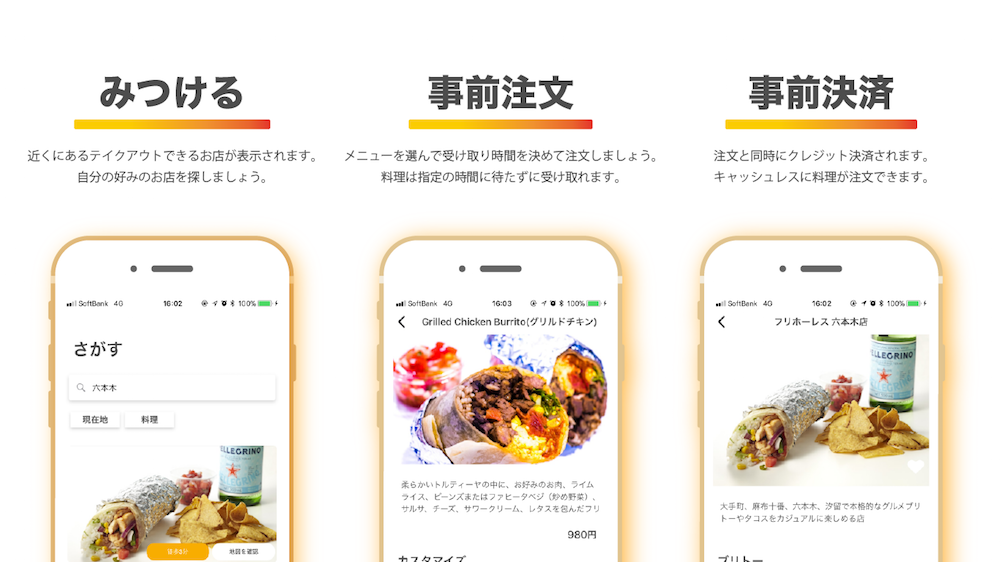 ユーザーはアプリから周辺エリアでPICKSに対応している飲食店を探し、メニューの選定から注文、決済までを事前に済ませておく。あとは注文時に指定した時間にお店にいくだけ。決済は完了しているので長い行列に待つ必要も、その場でお金を払う必要もない。
