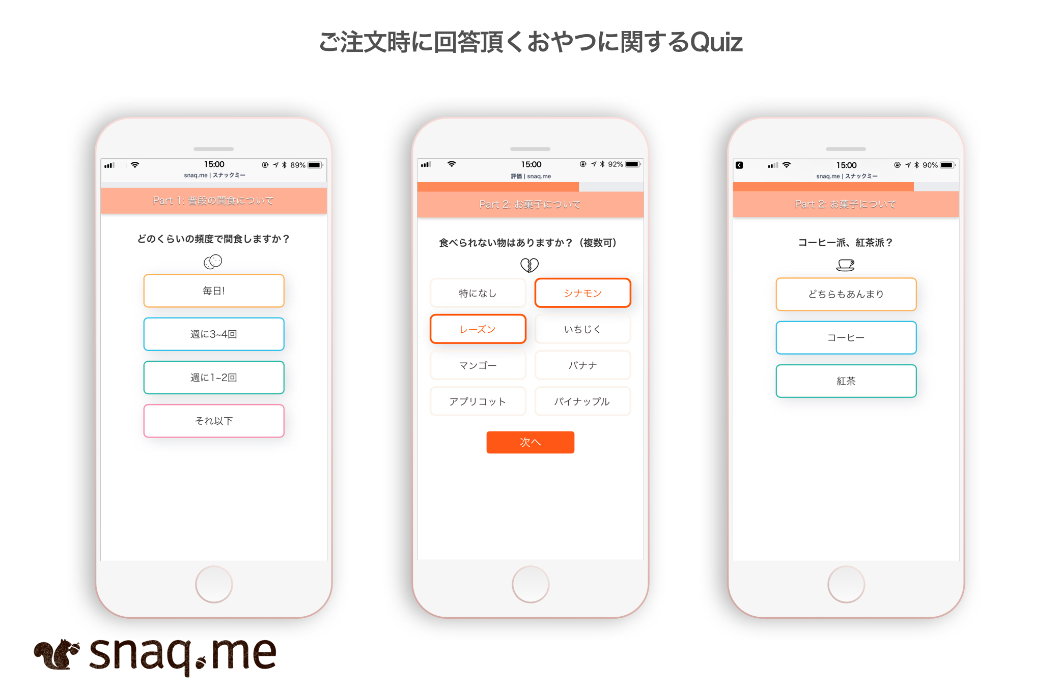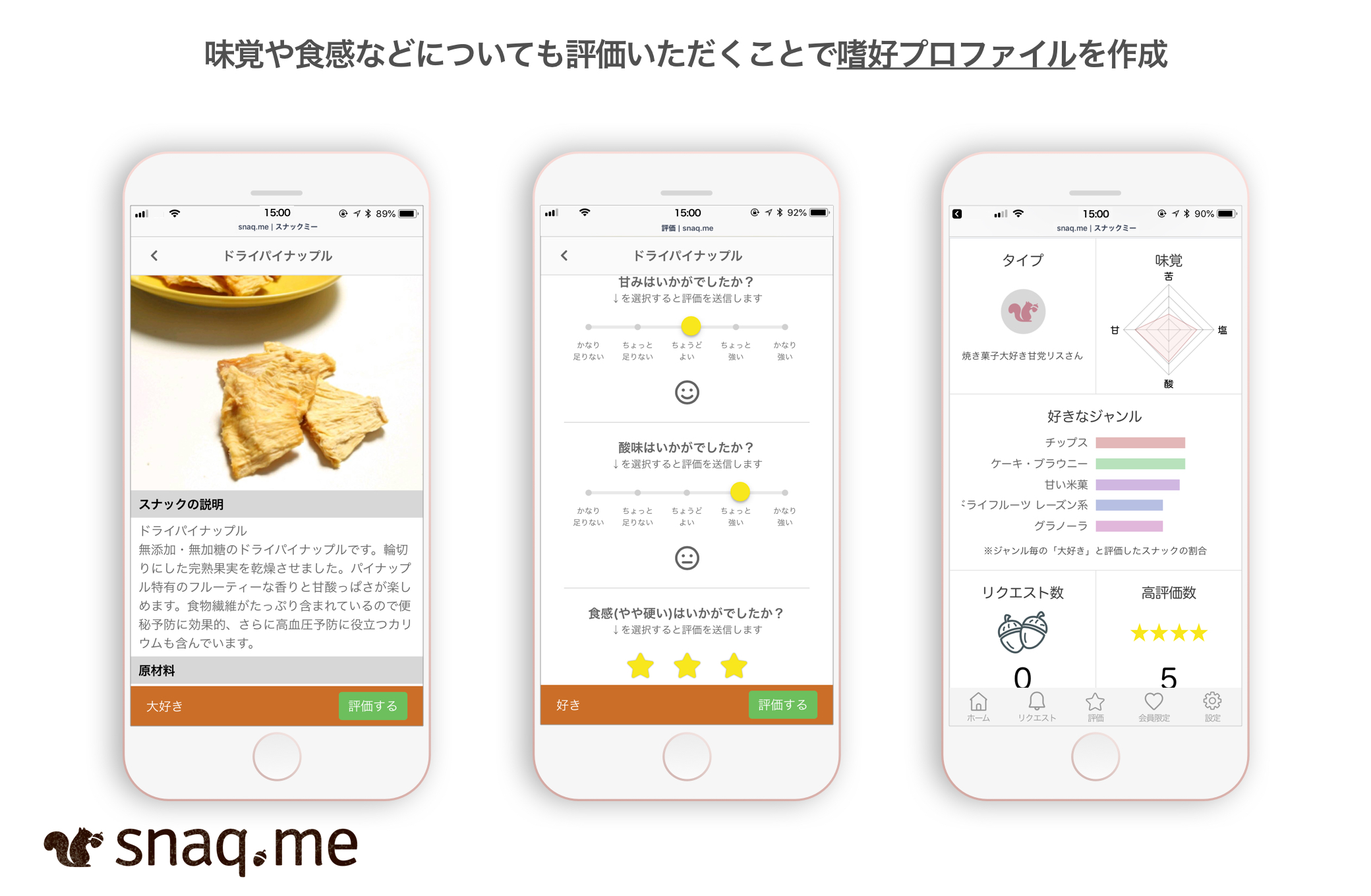 snaq.meに登録する際、ユーザーには自分の間食習慣や好きなお菓子の種類などを答える“クイズ”が出題される。それに答えることでsnaq.meはお菓子に対する好みを判断。それに合わせてスナックBOXの中身を調整する。また、届いたお菓子を1〜4の星の数で評価することもできる。それらの追加的なデータによってパーソナライズを深め、新製品の開発にも活かしていくというわけだ。