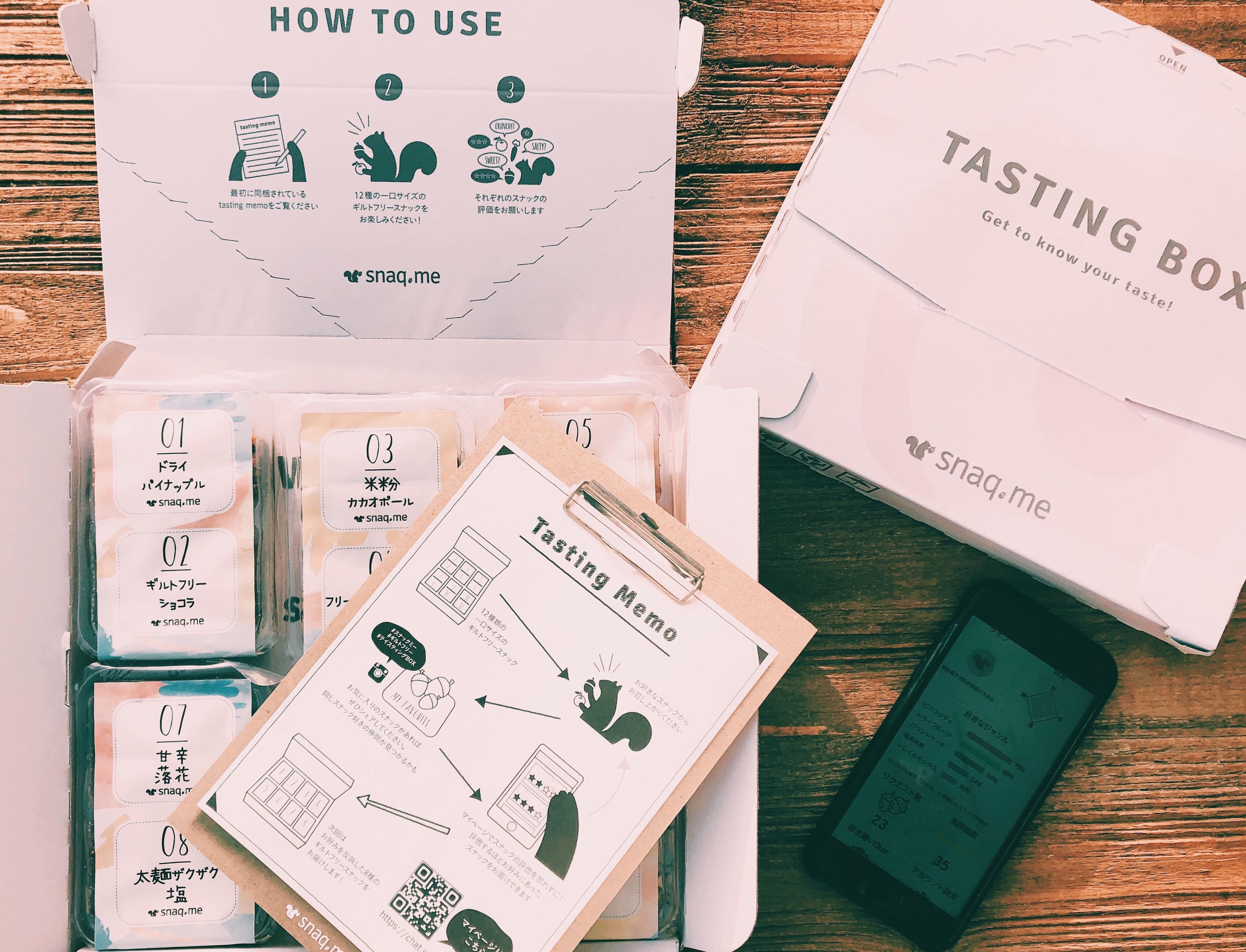 そして、5月22日にスナックミーが発表した新機能の「snaq tasting box」も、このパーソナライズという要素をさらに進化させるための試みだ。snaq tasting boxは1箱1058円の試食用スナックBOXで、合計12種類のミニスナックが詰め込まれている。ユーザーはそれぞれのスナックを食べてみて、専用ページから味、食感、フレーバーについての評価を入力していく。