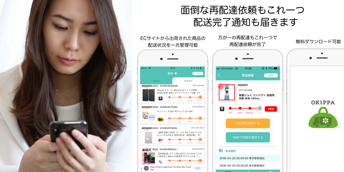 合わせてOKIPPAではバッグと連動するアプリを開発。OKIPPAに荷物が配送されると通知を受けとれるほか、Amazon、ZOZOTOWN、楽天で購入した商品の配送状況を管理することも可能。配送業者5社(ヤマト運輸、日本郵便、佐川急便、西濃運輸、Amazonデリバリープロバイダー各社)に対応し、もし再配達が必要になった場合もアプリから依頼できる。