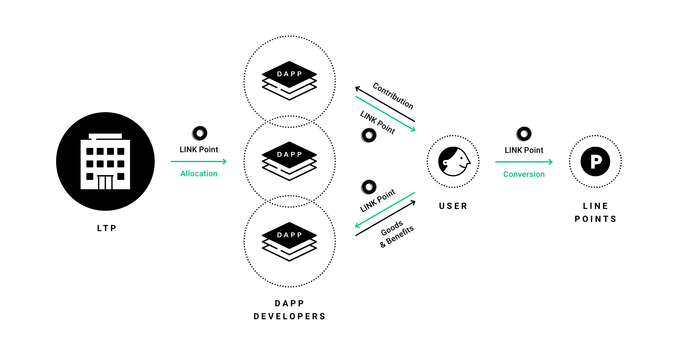 今回公開されたLINEエコシステムは、分散型アプリケーション(dApp)サービスが参加することでユーザーに対して汎用コインを付与することができる仕組み。これによってユーザーは同システムに参加するdAppサービスや、今後参加を計画している既存のLINEサービスに登録・利用すると、アクションやサービスへの貢献に応じてLINK PointやLINKを獲得できるようになる。