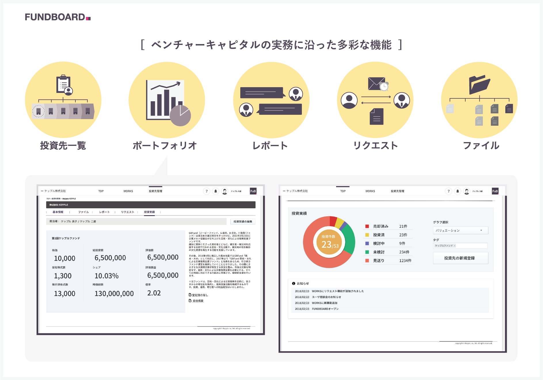 サービス上から投資先に対してファイルの提出や受け取り依頼をする機能(投資先の担当者に一時URL付きのメールが送信され、同サービスのユーザーじゃなくても閲覧できる仕様)や、投資実績として株価、保有株数、発行済株数などを登録することでポートフォリオをグラフ化する機能も備える。