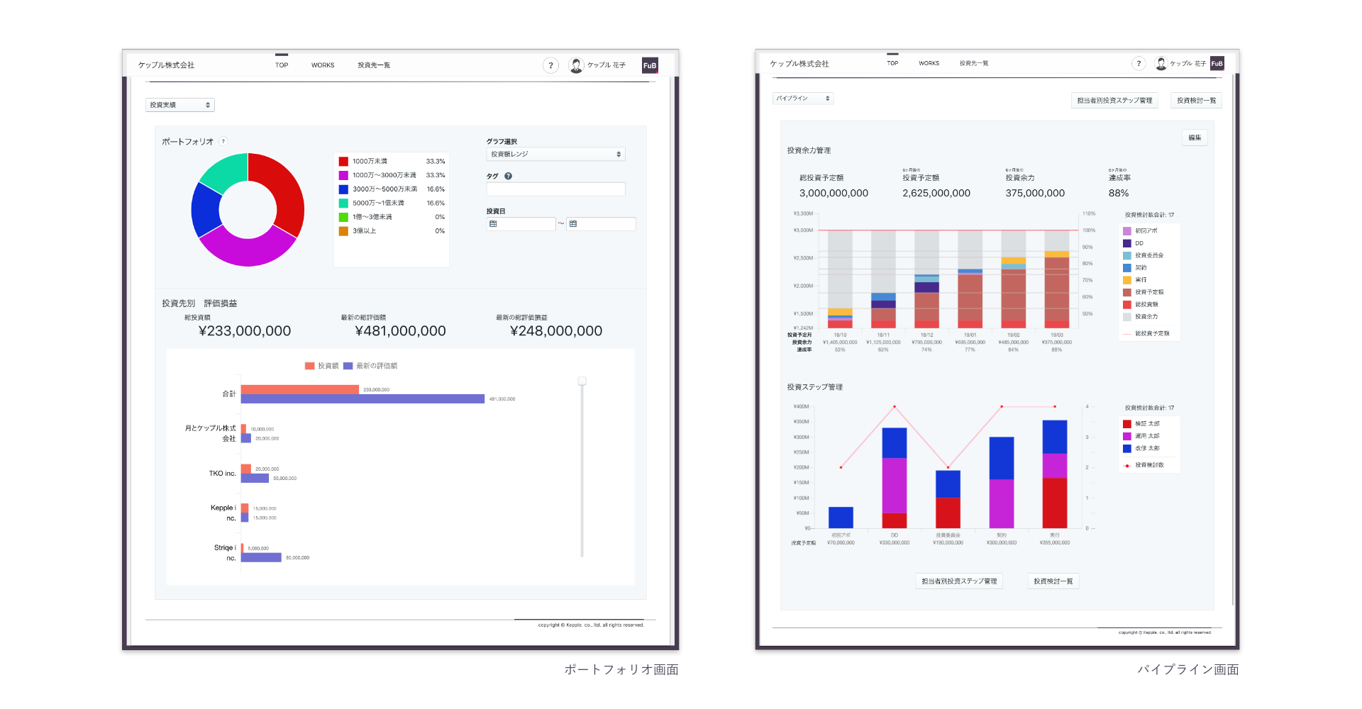 この機能では検討中の投資先ごとに投資予定日や予定額、投資ステップを管理することができ、集計された内容はグラフ化される。投資予定額を含めた投資総額が月単位で出力されるので、半年先までの投資予定額と投資余力を把握できるほか、各担当者ごとに抱えている案件の進捗を見える化することも可能だ。