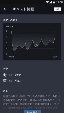 スマートルアーでは、釣りをした日時やルアーをキャストした位置、天候、水温、濁りの状況、ヒットした数などがわかる、ルアーと連動したスマホアプリも開発中だ。ルアーのキャストごとの情報をまとめた画面では、実際にセンシングしたデータを元に、ルアーがどの深さにいたか、どの深さでヒットがあったか、水温や濁りはどうだったかを表示する。