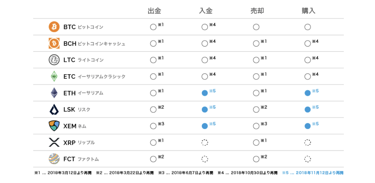同社は10月30日に新規口座開設と4種類の仮想通貨(BTC、BCH、LTC、ETC)の入金と、3種類の仮想通貨(BCH、LTC、ETC)の購入を再開している。同社がこれまでに再開してきた各取扱仮想通貨のサービス・機能は以下の通り。