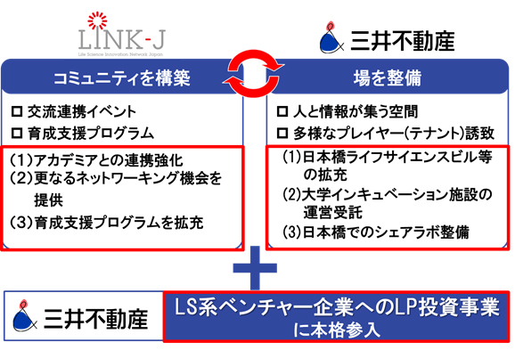 LINK-Jは、ライフサイエンス領域でのオープンイノベーション促進、新産業創造支援を目的として、三井不動産と産学の有志が中心となって設立した一般社団法人だ。イノベーションの「場の整備」に取り組む三井不動産とともに、国内外のアカデミアや海外団体との連携による「コミュニティ構築」に取り組んでいる。
