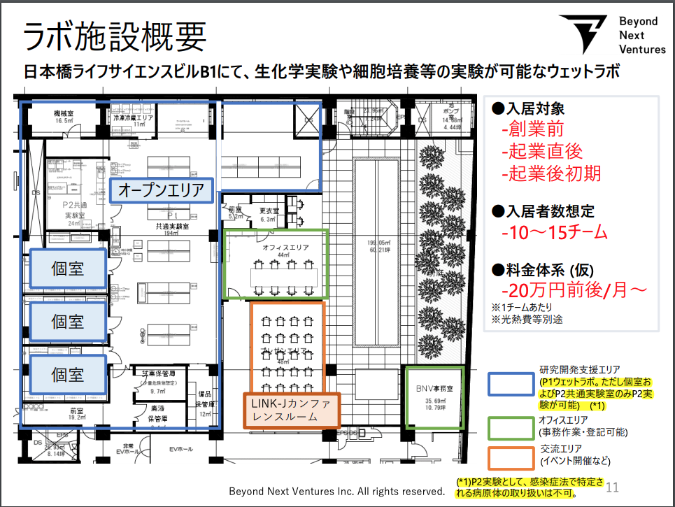 さて、日本橋はデパートや老舗など、商業の中心地のイメージが強いが、実は江戸時代から薬種問屋が軒を連ね、現代でも医薬関連企業が集積する地域だ。その地で三井不動産がスペースを提供し、LINK-Jも入居する日本橋ライフサイエンスビルディングの地下にシェア型ウェットラボ、Beyond BioLAB TOKYOがオープンする。ラボは三井不動産からBNVヘフロアを賃貸し、BNVが整備してライフサイエンス領域のスタートアップと契約する形で運営される。