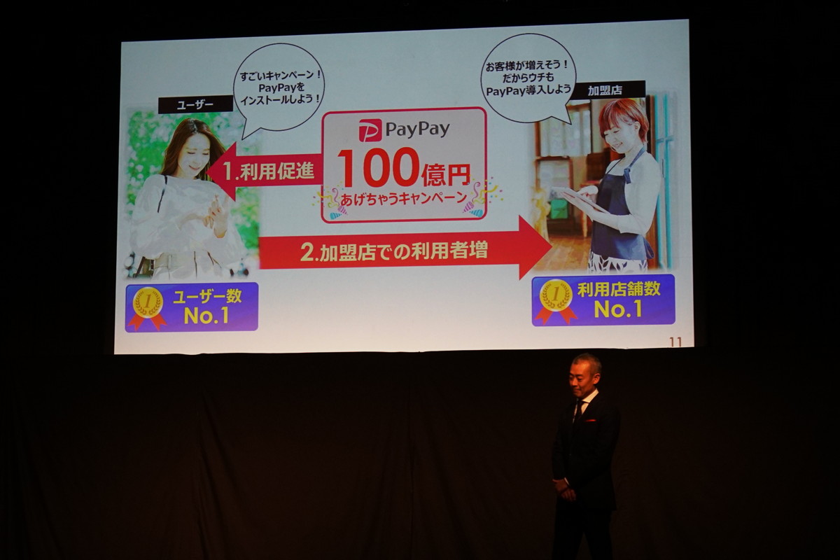 今回の”100億円”キャンペーンは、ユーザーの拡大に加えて、小規模加盟店の開拓を進める狙いがあります。PayPayの中山一郎CEOは「ユーザーと加盟店の獲得のために、100億円を投じる。QR決済市場のユーザー数と加盟店数、両方でナンバーワンを目指す」と宣言しました。キャンペーン原資についてはソフトバンクとヤフーの両社がPayPayに出資した金額を拠出すると説明しています。