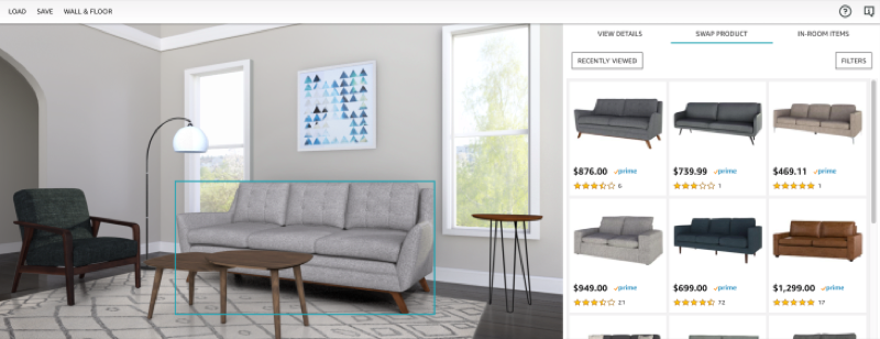 現段階では、この新機能はAmazonの顧客に対して、1つのリビングルームの中の商品をまとめることに焦点を当てている。仮想的な設定の中で、利用者は壁と床の色を調整することが可能で、室内になるアイテムをそれぞれ選んで入れ替えて行くことができる。入れ替えることができるのはソファ、コーヒーテーブル、椅子、サイドテーブル、ランプ、カーペットで、さらには壁に掛かった絵も替えることが可能だ。