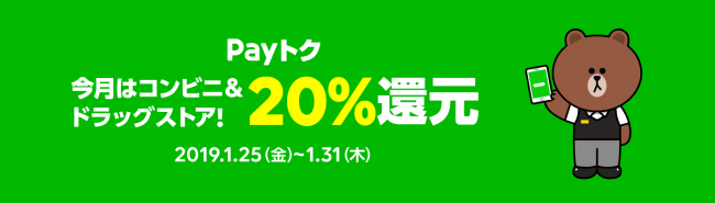 LINE Payは、LINEアカウントで使えるモバイル送金・決済サービス「LINE Pay」でいつでも20%還元が受けられる「Payトク」キャンペーンを開始する。実施期間は、1月25日~31日までの7日間。2018年12月に開催した「PayトクSpecial」に続くユーザー還元キャンペーンだ。