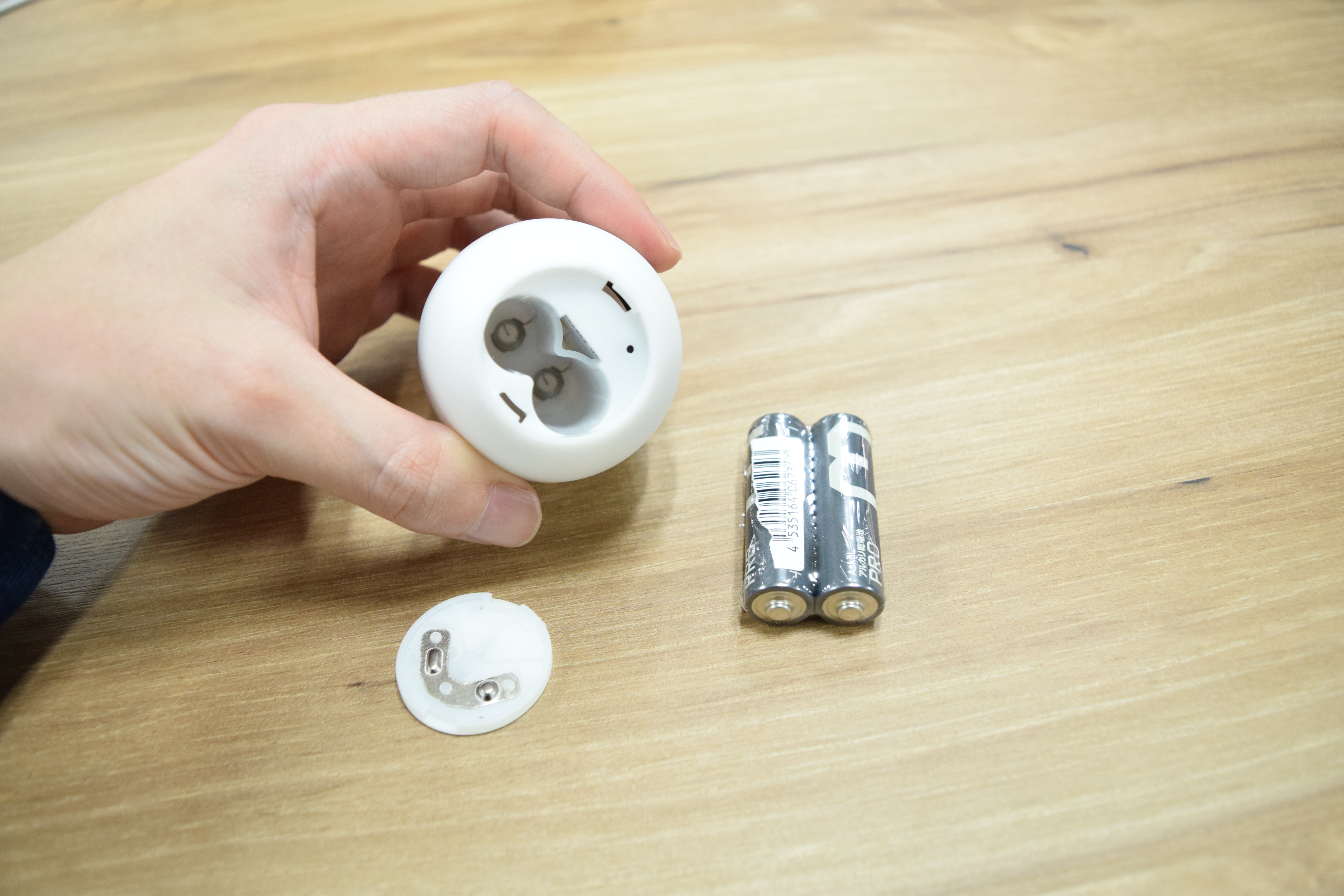 電池を本体に入れるためには、Eggの下側にある蓋を開ければいい。ただ、この蓋を開けるためには小さな溝にコインを差して回す必要があって、そのあとに蓋をパカっと開けるのも、ちょっと固くて一苦労だった。