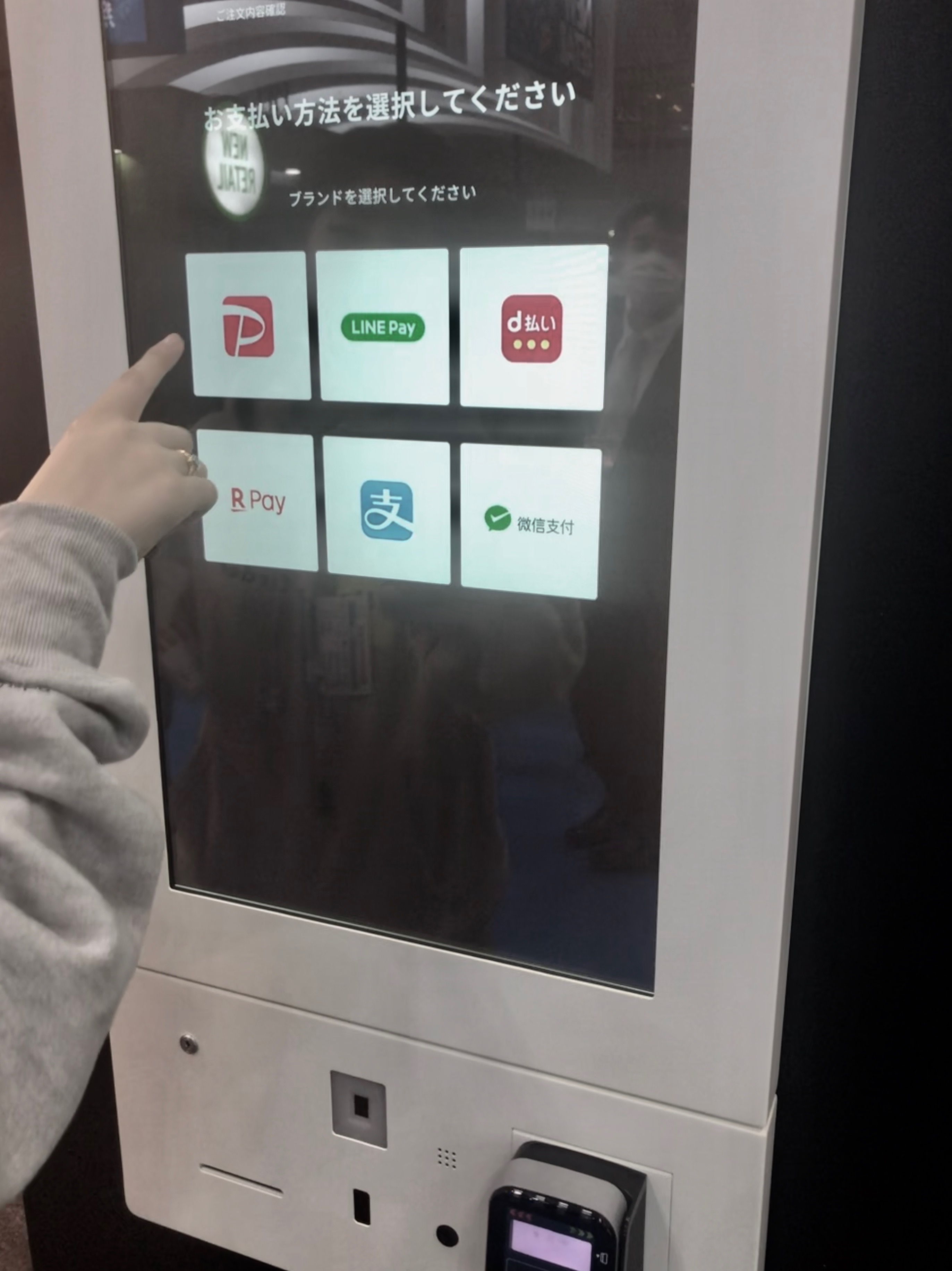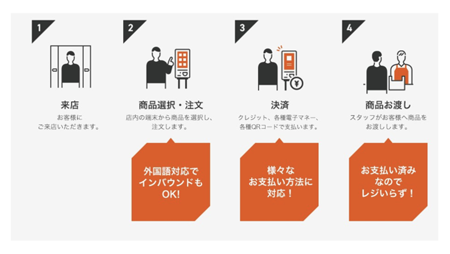 利用フローとしては、来店後にO:der Kioskから商品を選択、注文し、決済。そして商品を受け取るだけ。クレジット、Suicaなど交通系電子マネーや各種QRコードを含むマルチ決済対応となっていて、言語は日本語以外にも英語、中国語、韓国語に対応している。