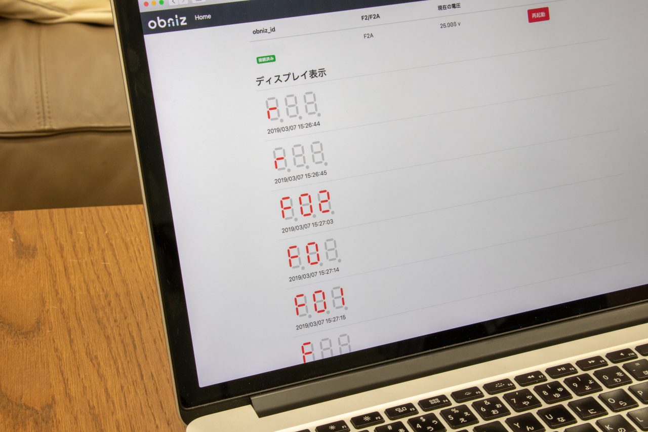 今回の実証実験ではWeb上からobnizを搭載した機器の電圧を遠隔からリアルタイムで確認できるほか、発生したエラーを日付順で把握する機能や、ボタンを押すことで再起動する機能を提供する。