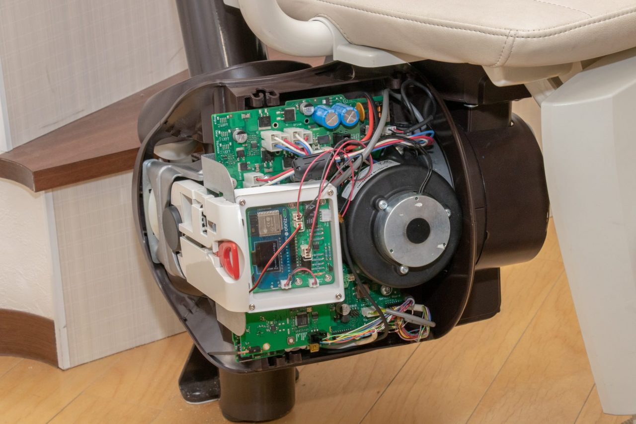 在宅介護が増える中、家庭用のいす式階段昇降機は日本国内だけでも10万台以上が利用されているそう。オフィスビルのエレベーターなどに使われている遠隔監視や臨時対応システムは一般的に導入されておらず、安全性向上や人的コスト削減の観点で改良の余地があったという。