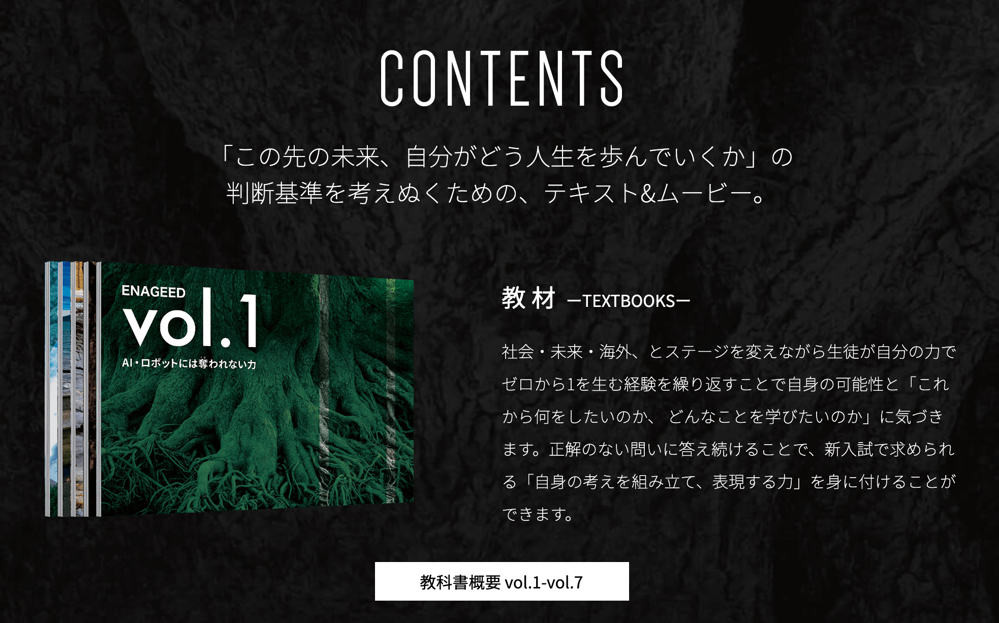 同社は、「『AIやロボットには代替の効かない、これからの時代に人が求められる力』を全国に展開する」というビジョンを掲げて、2016年より中学・高校生向けの補助教材「次世代型キャリア教育ENAGEED」の提供を開始。ENAGEEは、7冊のワークシートとムービーで構成されていおり、全国160校以上の国公私立の中学・高校のほか、学習塾で採用されているとのこと。具体的には、同志社中学校、立命館宇治中学校、滝川中学校・高等学校、三重県立聾学校、埼玉県立草加西高等学校、帝塚山中学校・高等学校、英進館、田中学習会など。