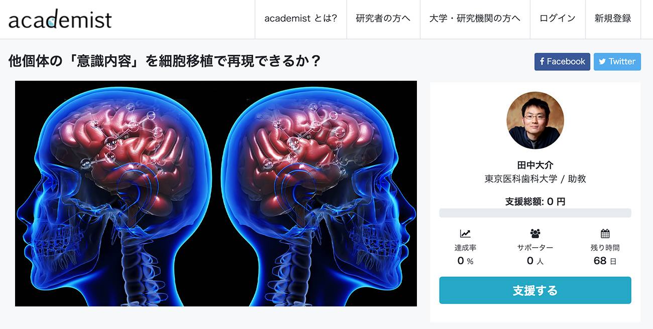 もう1つは神経科学の分野で、他の個体の「意識内容」を細胞移植で再現できるか、という研究だ。リンゴを見て「赤い」と感じたり、食べて「おいしい」と感じたりするとき、その「赤さ」「おいしさ」は意識内容と呼ばれる。非物質である意識内容は、物質である脳からどのように生み出されるのか。東京医科歯科大学大学院 医歯学総合研究科助教の田中大介氏が、「細胞移植により、特定の意識内容を生み出している神経基盤を複数の個体間で再現する」というコンセプトを実証するための基礎研究に対して支援を募る。