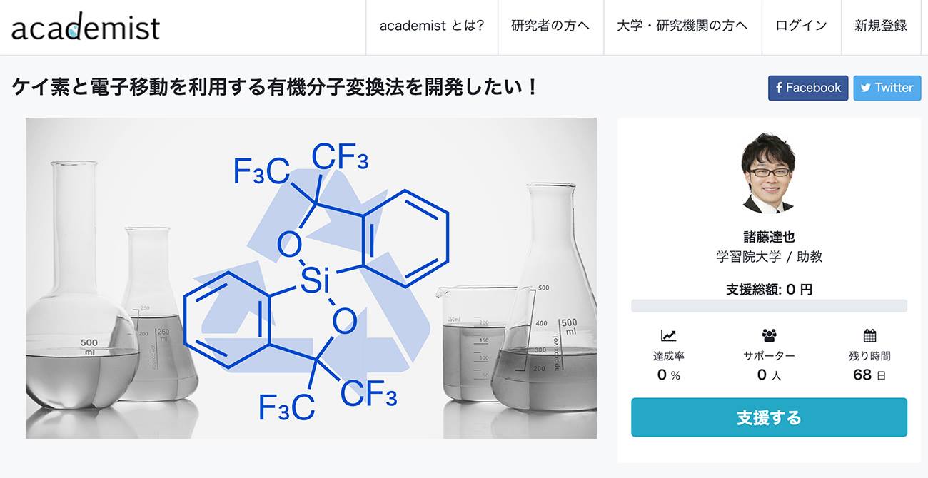 今回公開されたプロジェクトの1つは有機合成化学の分野で、従来の方法によらない有機合成の手法を研究したいというもの。「有機化学の発展には、新しい分子の合成ルート開発が求められる。そのためには、今までに知られている手法だけでなく、新たな分子変換の方法を開発することも重要」と考える学習院大学理学部助教の諸藤達也氏が、ケイ素と電子移動を利用する新しい有機分子変換法の開発を目指す。