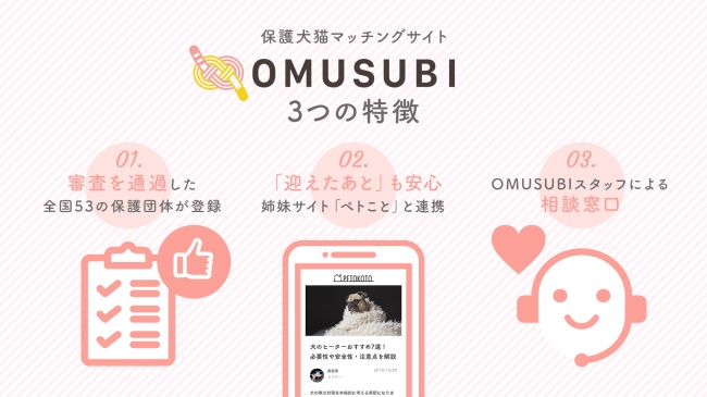 保護団体と保護犬猫を飼いたいユーザーを繋ぐOMUSUBIの特徴は「保護団体の完全審査制を採用していること」と「転職エージェントのように密なカスタマーサポートを実施していること」の2点だ。譲渡トラブル回避や譲渡率向上のために、保護団体の現地調査や資格調査、運営状況調査などを実施しつつ、お迎えコンシェルジュとしてユーザーのサポートを手厚くすることで細かいニーズを汲み取る。